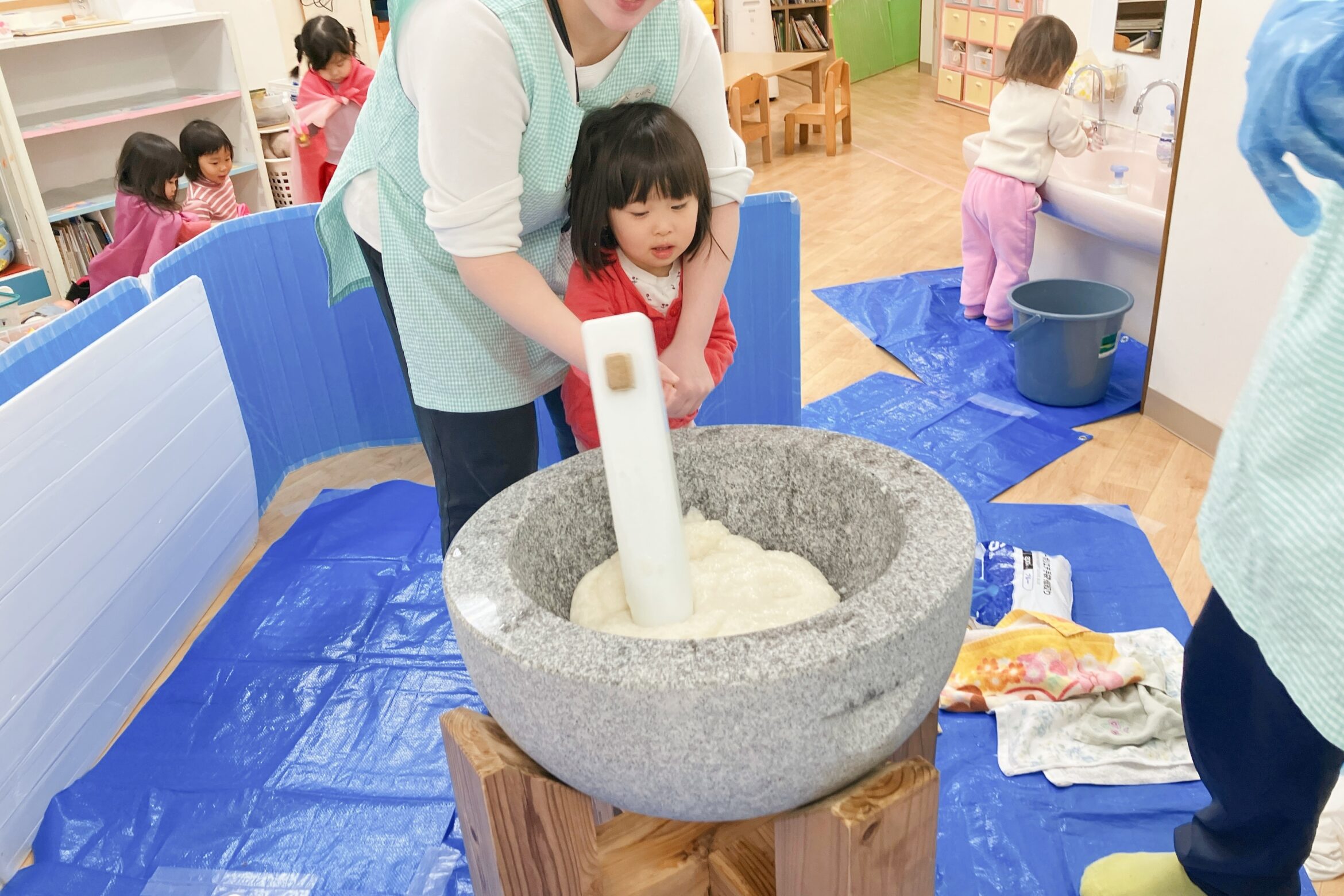2歳~5歳児クラスは、実際の〈杵と臼〉を使いました。2歳児と3歳児は保育者と一緒におもちつきを楽しみました!