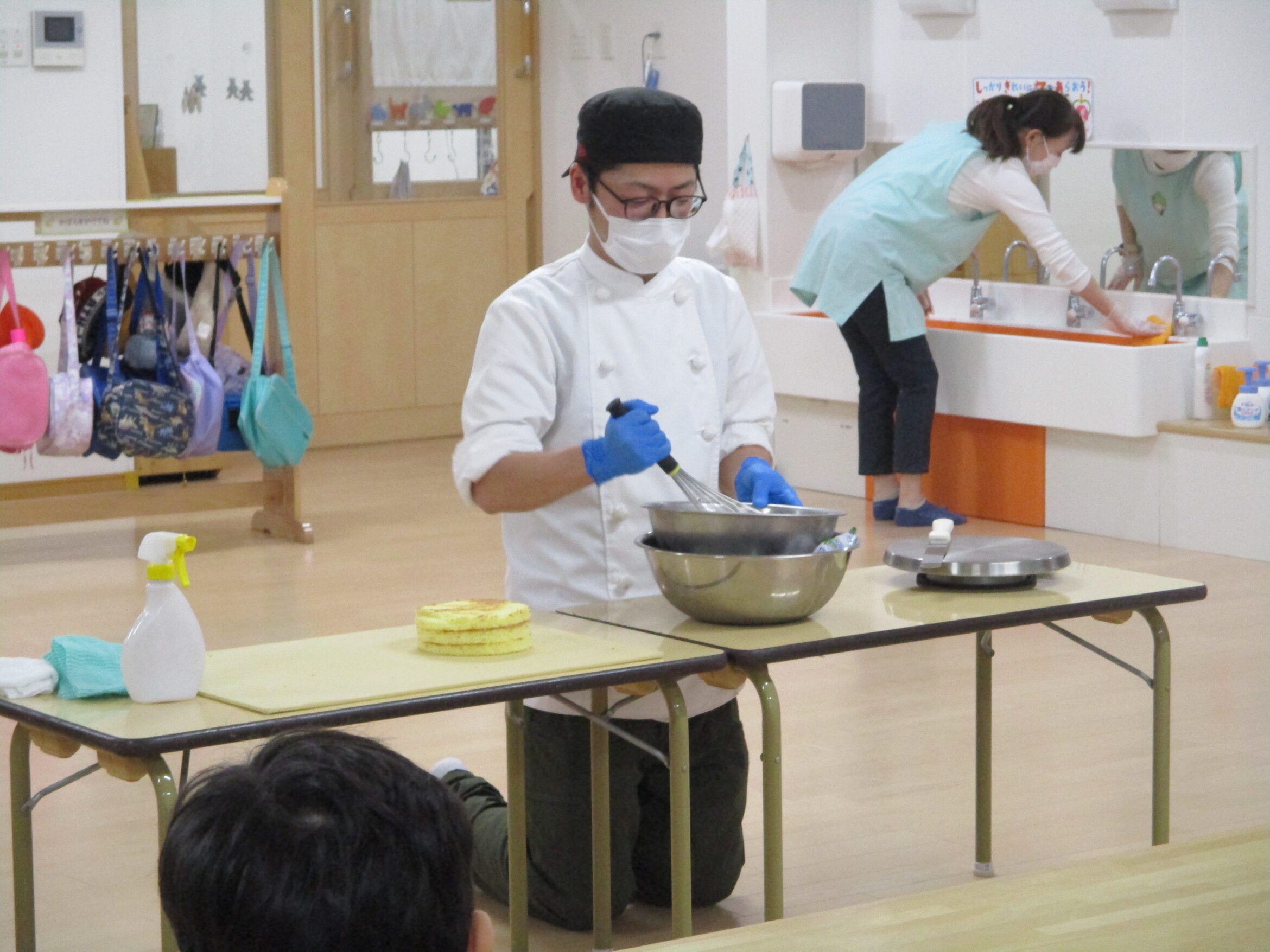 クリームを泡立てる様子や塗る様子を見た子どもたちから、歓声や拍手が響きました。