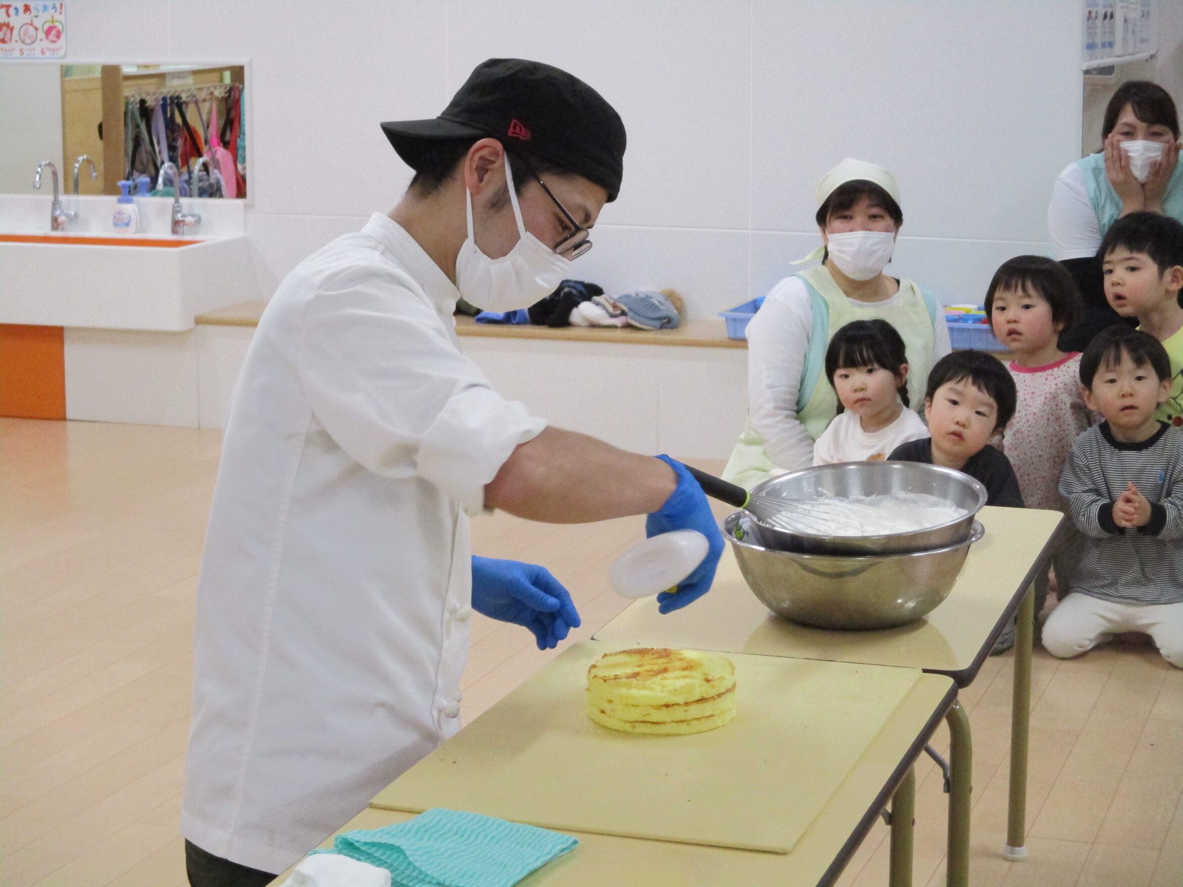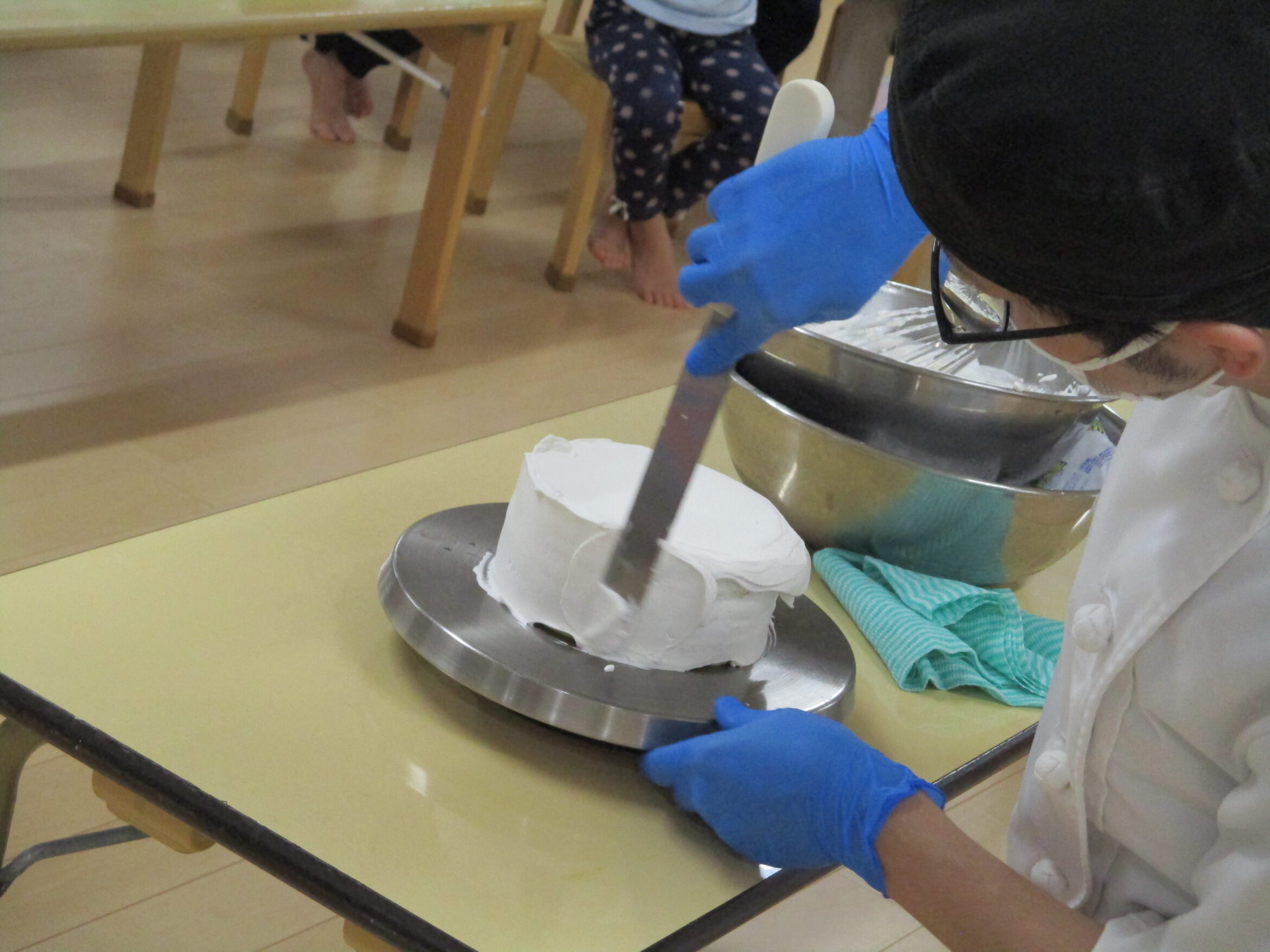 クリームがきれいに塗られていくケーキに、子どもたちの目は釘付けでした。