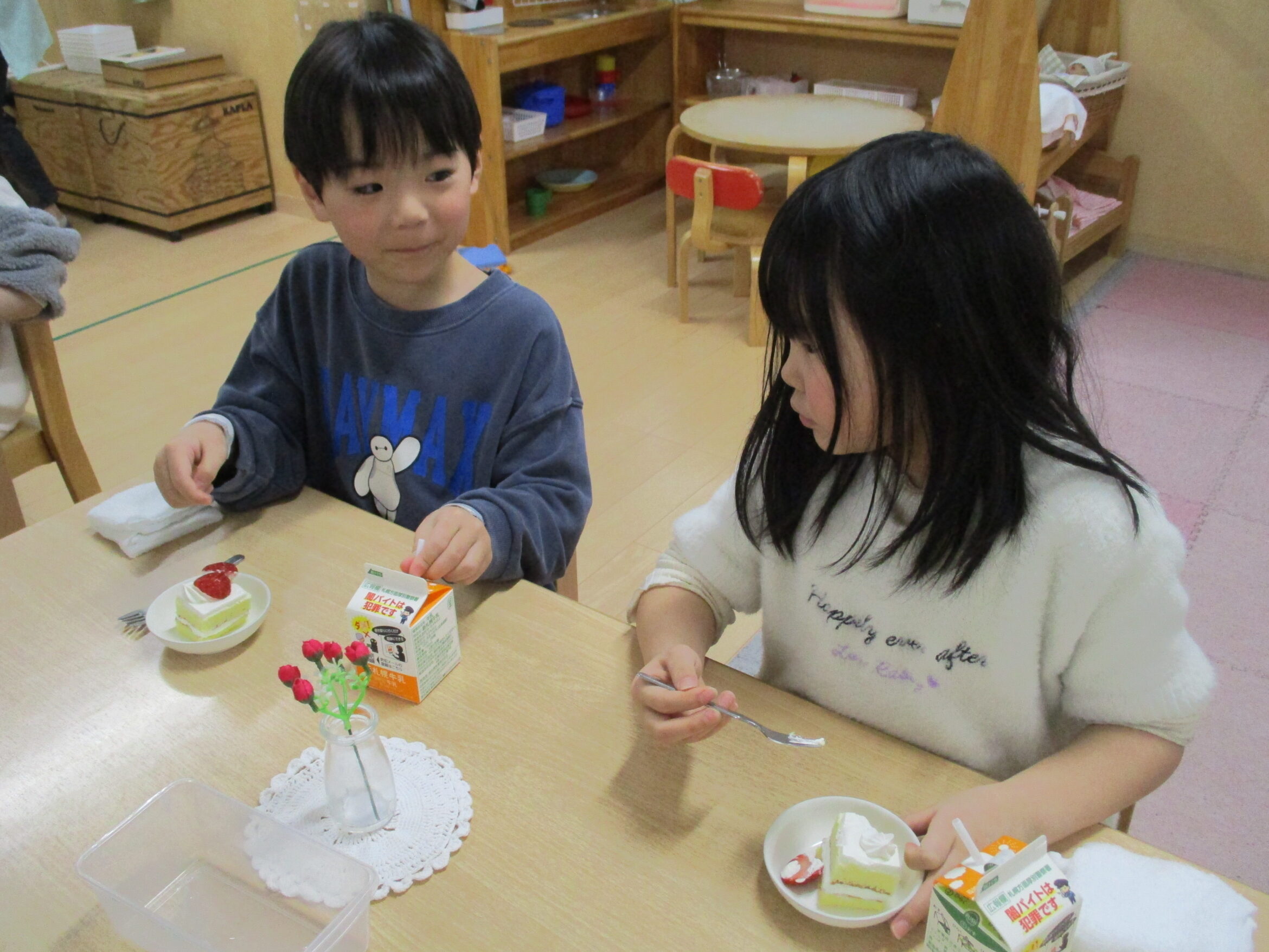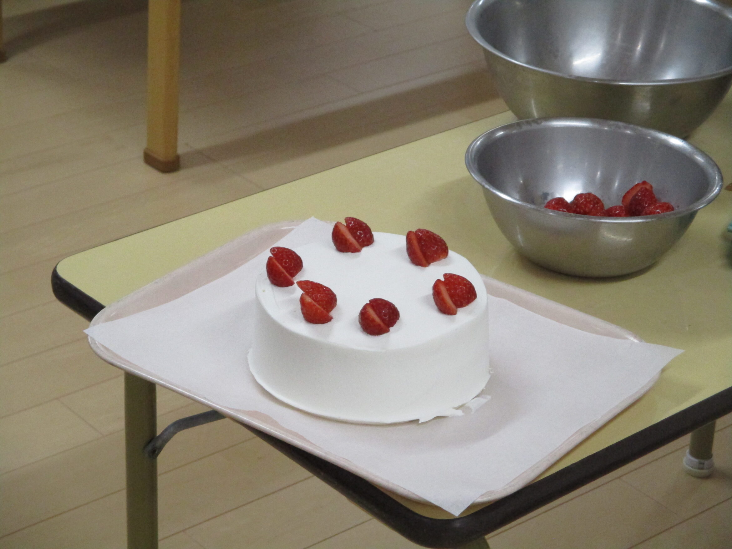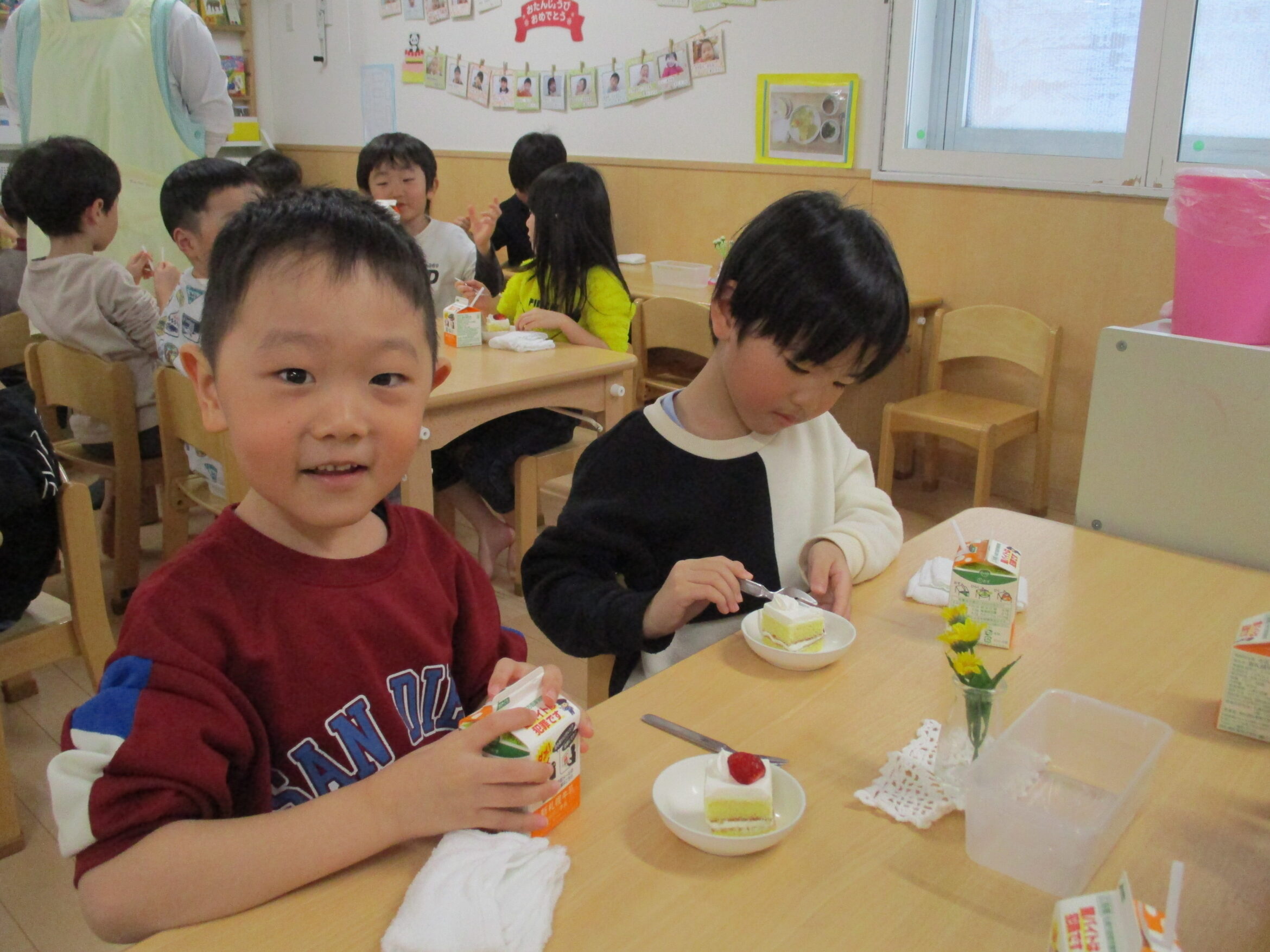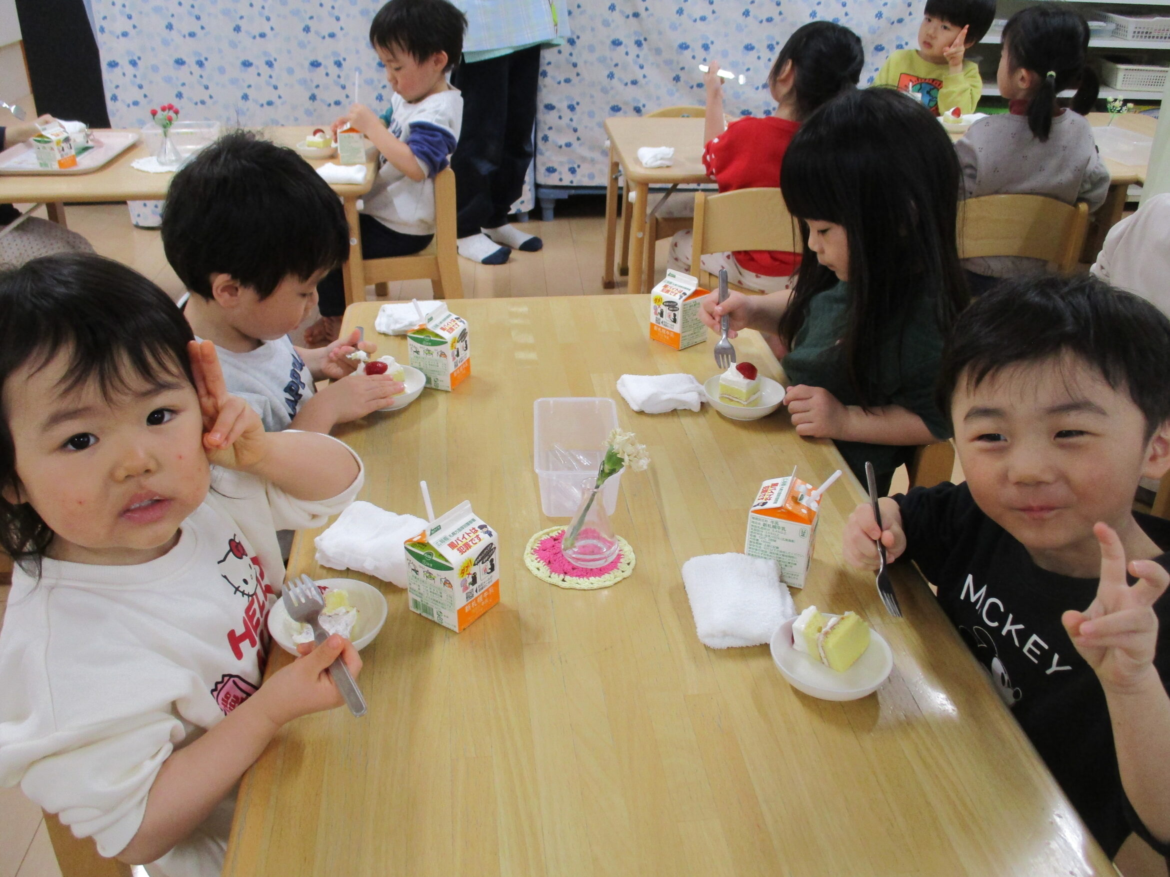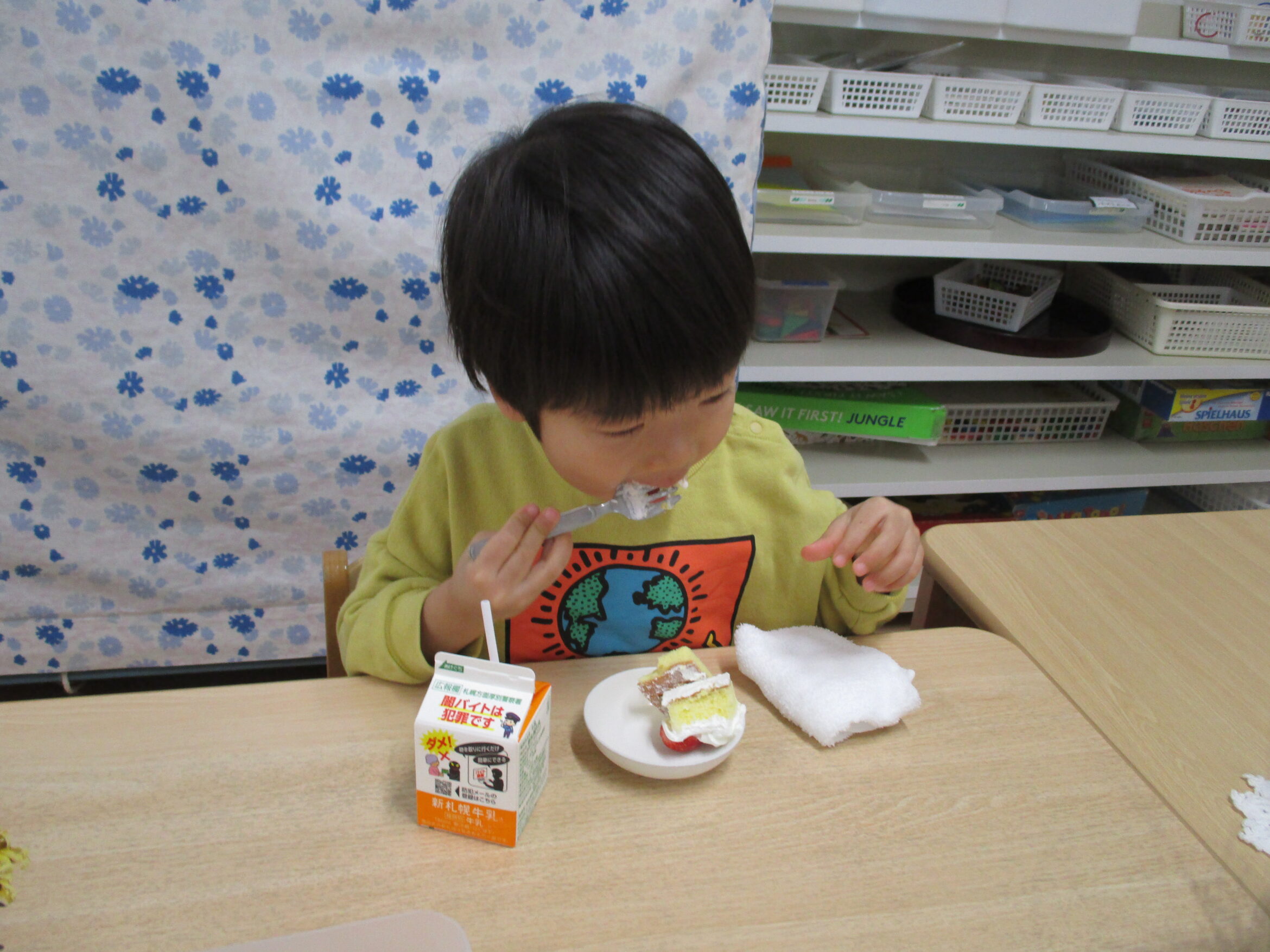 おやつはもちろんショートケーキ!甘くてフワフワ、とってもおいしいケーキにみんな大満足でした。