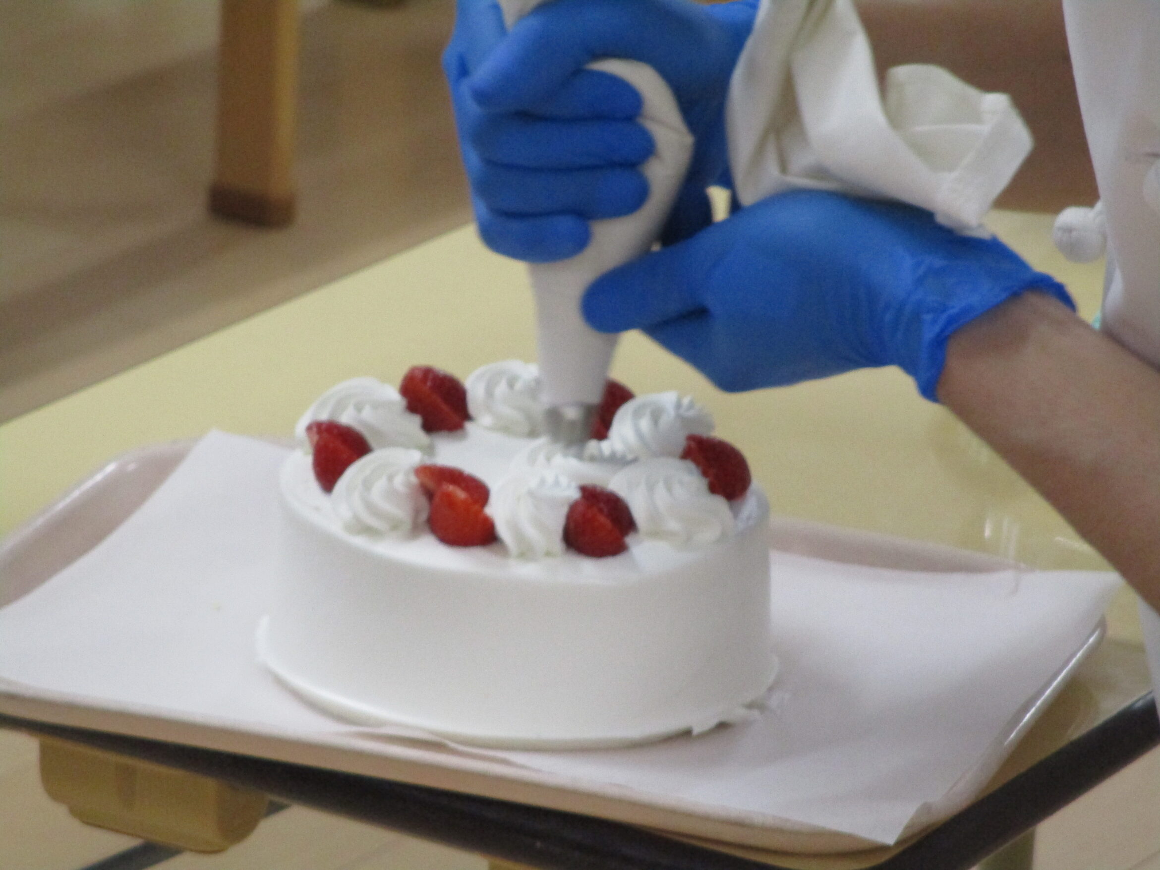 ご近所のケーキ屋さんのパティシエさんが来て、ケーキのデコレーションを見せてくれました。