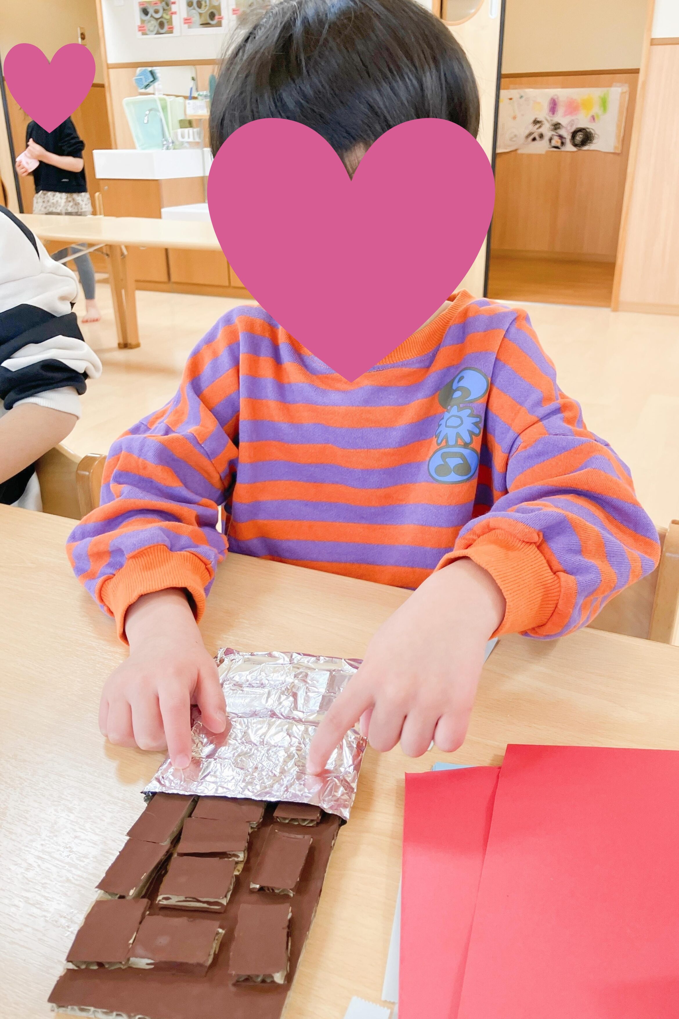 ダンボールに色を塗って、並べていくと少しずつチョコレートができてきて、「おいしそうだね!」とお友だちとの会話を楽しみながら取り組んでいました。