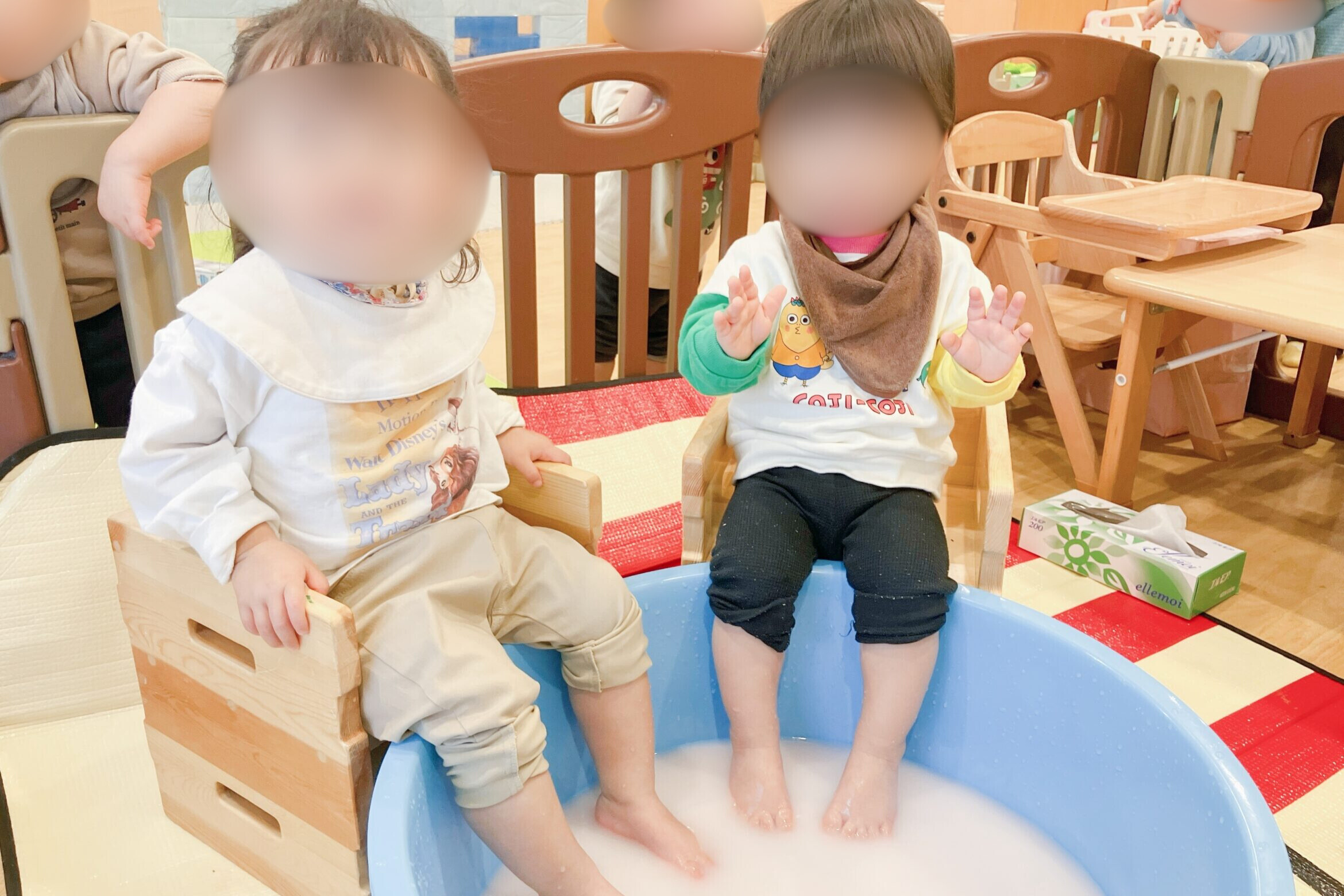 2026.03.19 初石保育園 あったか~い「ももの湯♨」 だんだんと春の日差しを感じられる日が増えてきました。 先日のとても寒かった日、もも組(0歳児クラス)で「ももの湯」がオープンしましたよ♨ ほんのり桃の香りのするお湯で足湯を楽しみました♪ 春が待ち遠しいね🌸