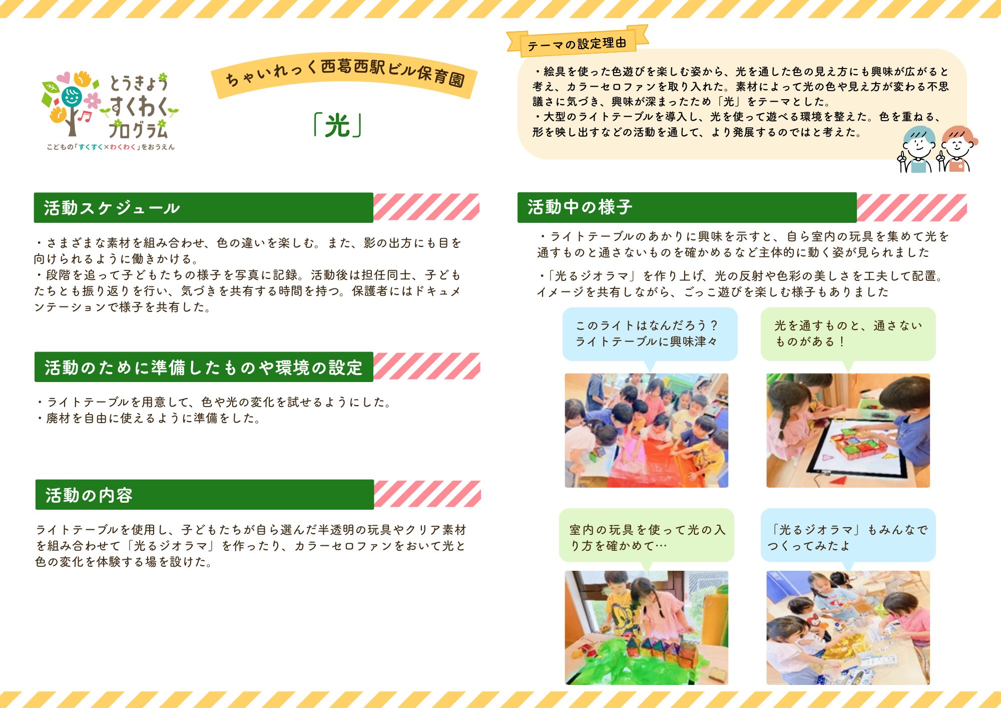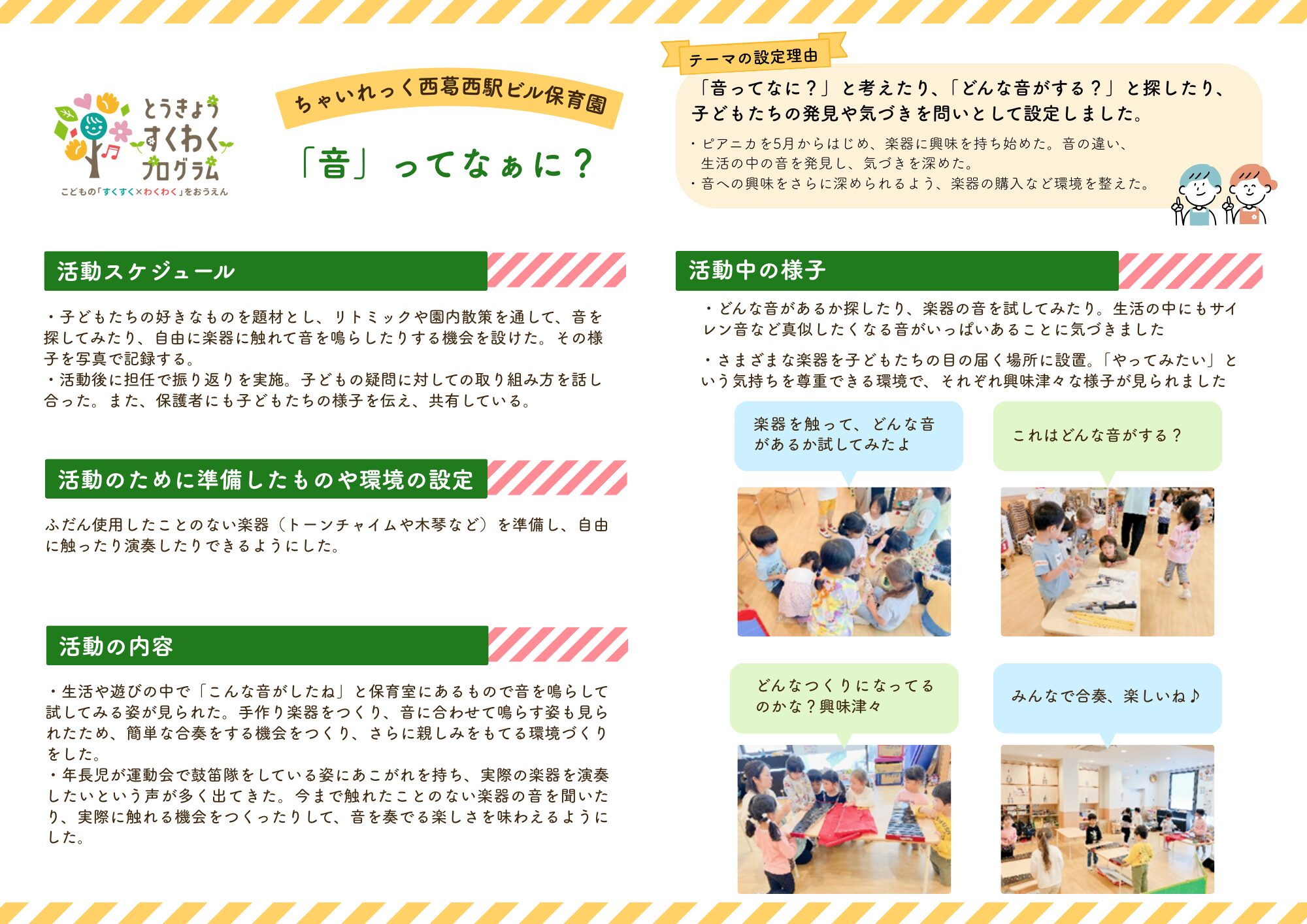2026.03.19 西葛西駅ビル保育園 とうきょうすくわくプログラム ちゃいれっく西葛西駅ビル保育園では、東京都が実施する「とうきょうすくわくプログラム」に参加しています。 とうきょうすくわくプログラムとは、子どもたちが好奇心や興味をもって、わくわくしながら遊び、学べるよう応援する取り組みです。 今年度は、4歳児クラスが「音」をテーマに、4・5歳児クラスが合同で「光」をテーマに1年間取り組みました✨ 取り組みを通して、たくさんの発見や気づきを得た子どもたち。活動の内容や様子をぜひご覧ください♪ 報告書(4歳児クラス)はこちら報告書(4・5歳児クラス)はこちら
