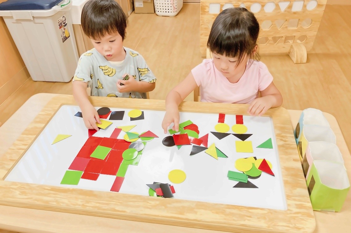 7. 形合わせ玩具や形のマグネットボードなどを使い、自分なりの形を作り楽しむ。