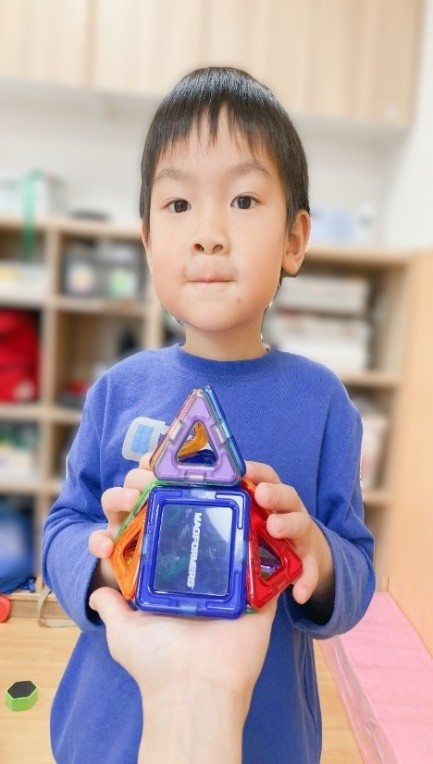 ・マグネットシートは□や△のシートをうまくつなげると、大きな△になることに気付き、驚きながらもやってみようとする子が多かった。
