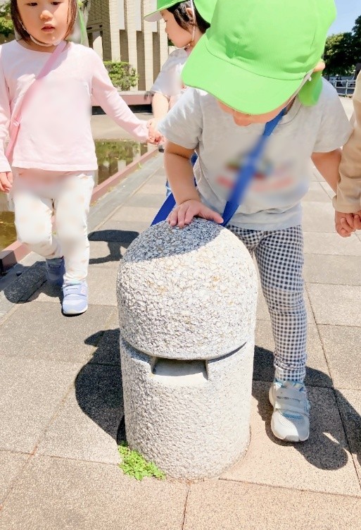 ・戸外での○(丸)探しでは、保育園を出たすぐそばからたくさん見つけ、進むのに時間がかかるほどだった。標識やマンホール、地面に映った影など、さまざまな○を見つけ喜ぶ姿が見られた。ダンゴムシは触ると丸くなり、その不思議に驚くとともに地面に映った影などいろいろな○を見つけることができた。