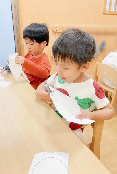・ハサミの取り組みでは、真っすぐの□や△の方が簡単で、○が難しいということに気付いていた。