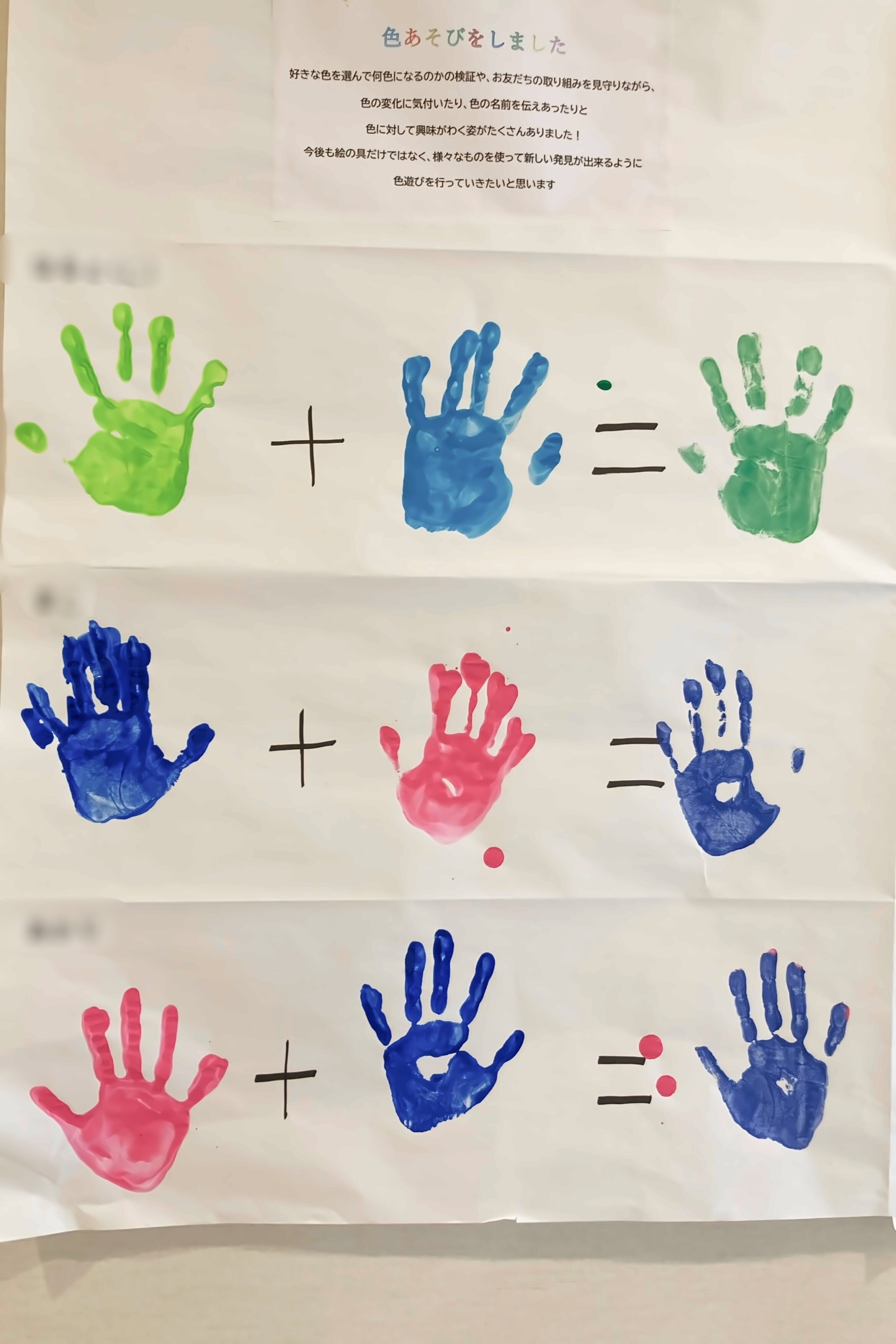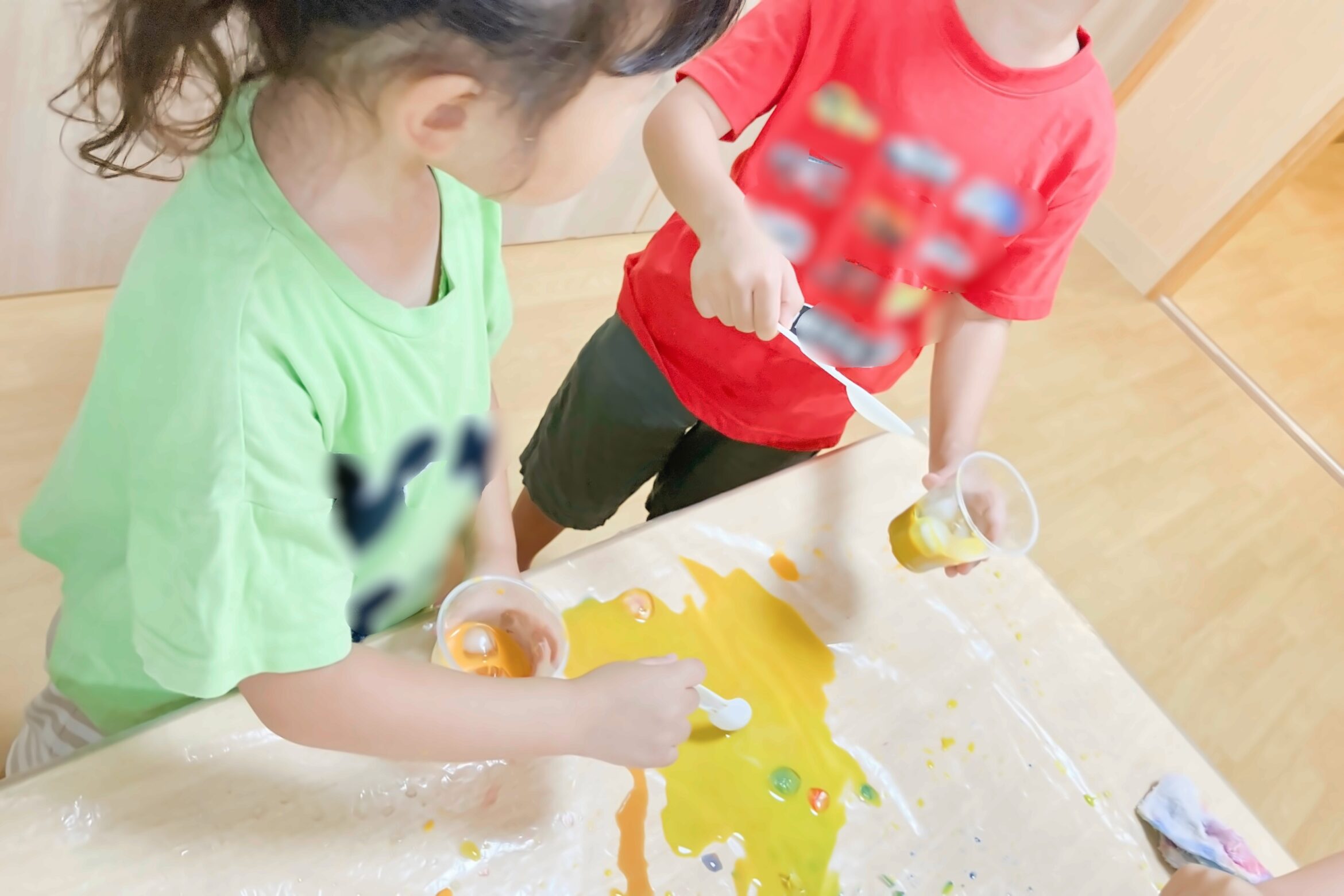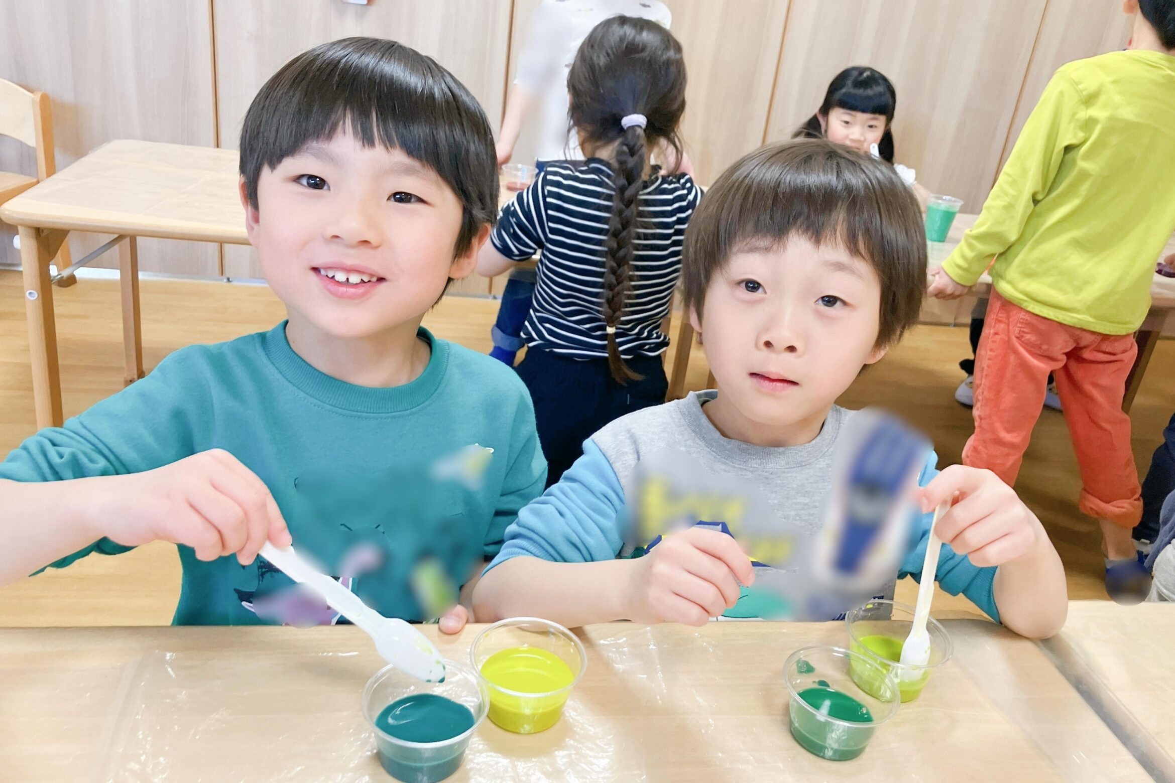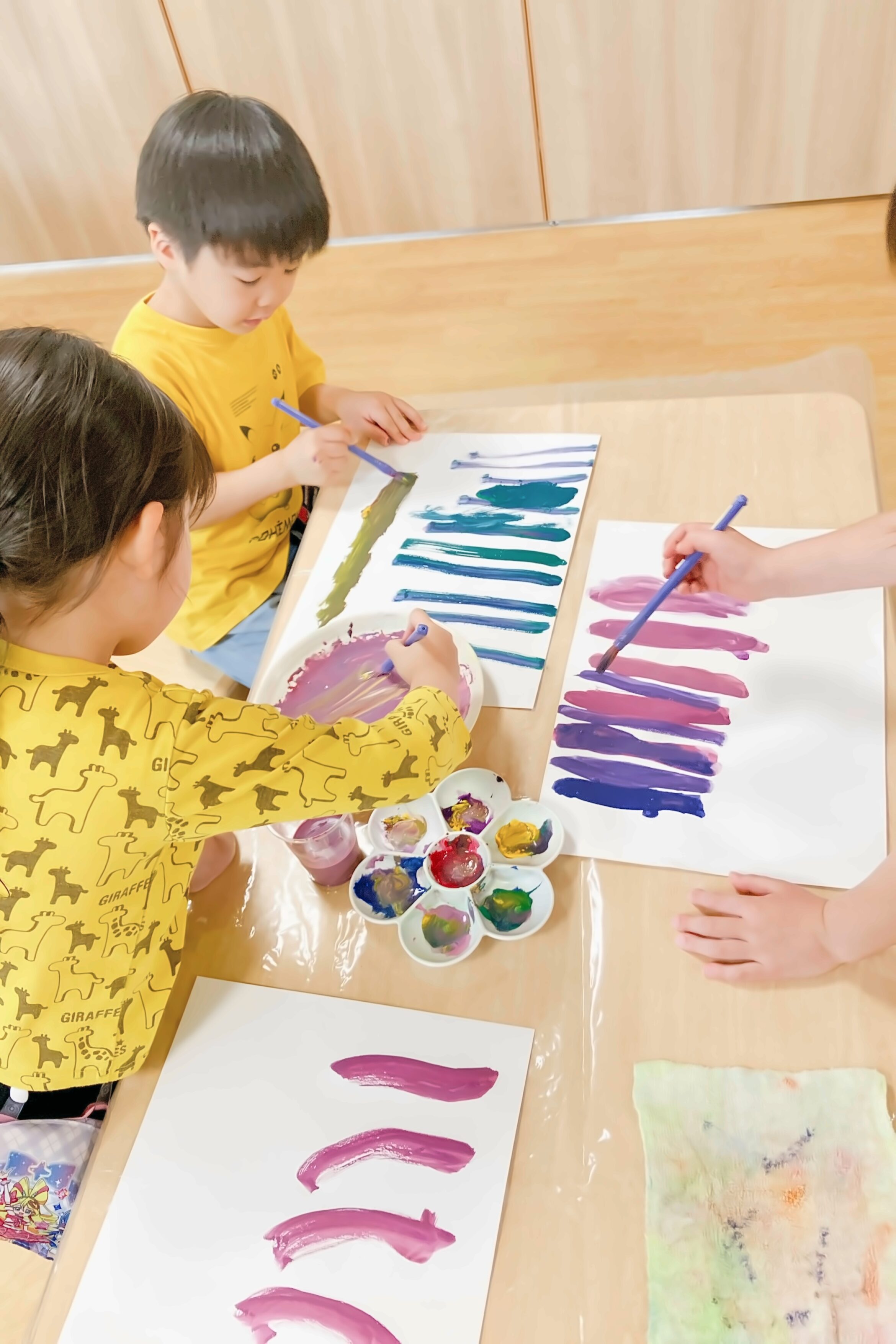 好きな絵の具を2種類選び、混ぜたら何色になるのかをワクワクしながら楽しみました。思った色になって喜ぶ子、思っていたのと少し違って「もっとこうしたかった」と話す子も。