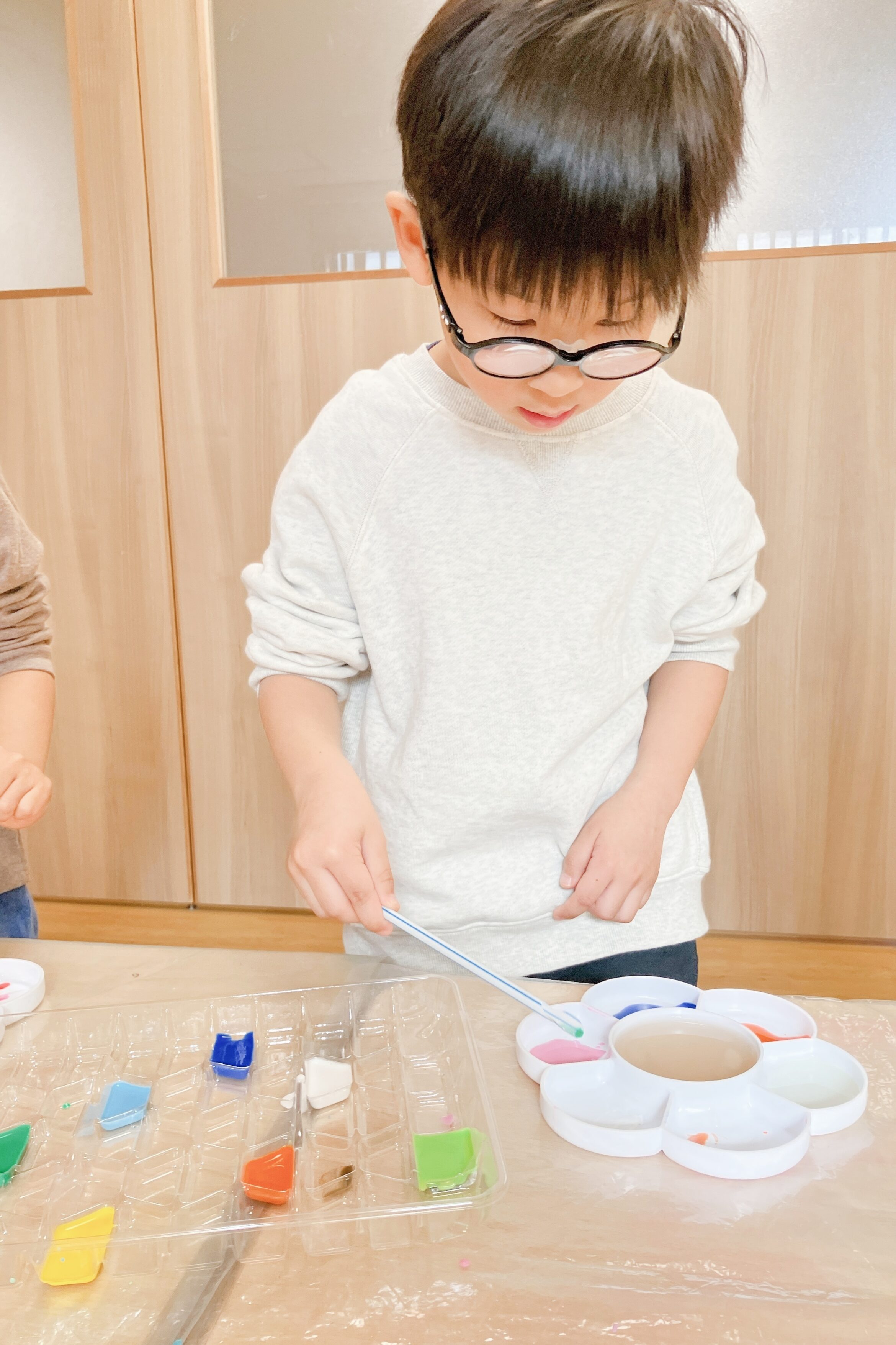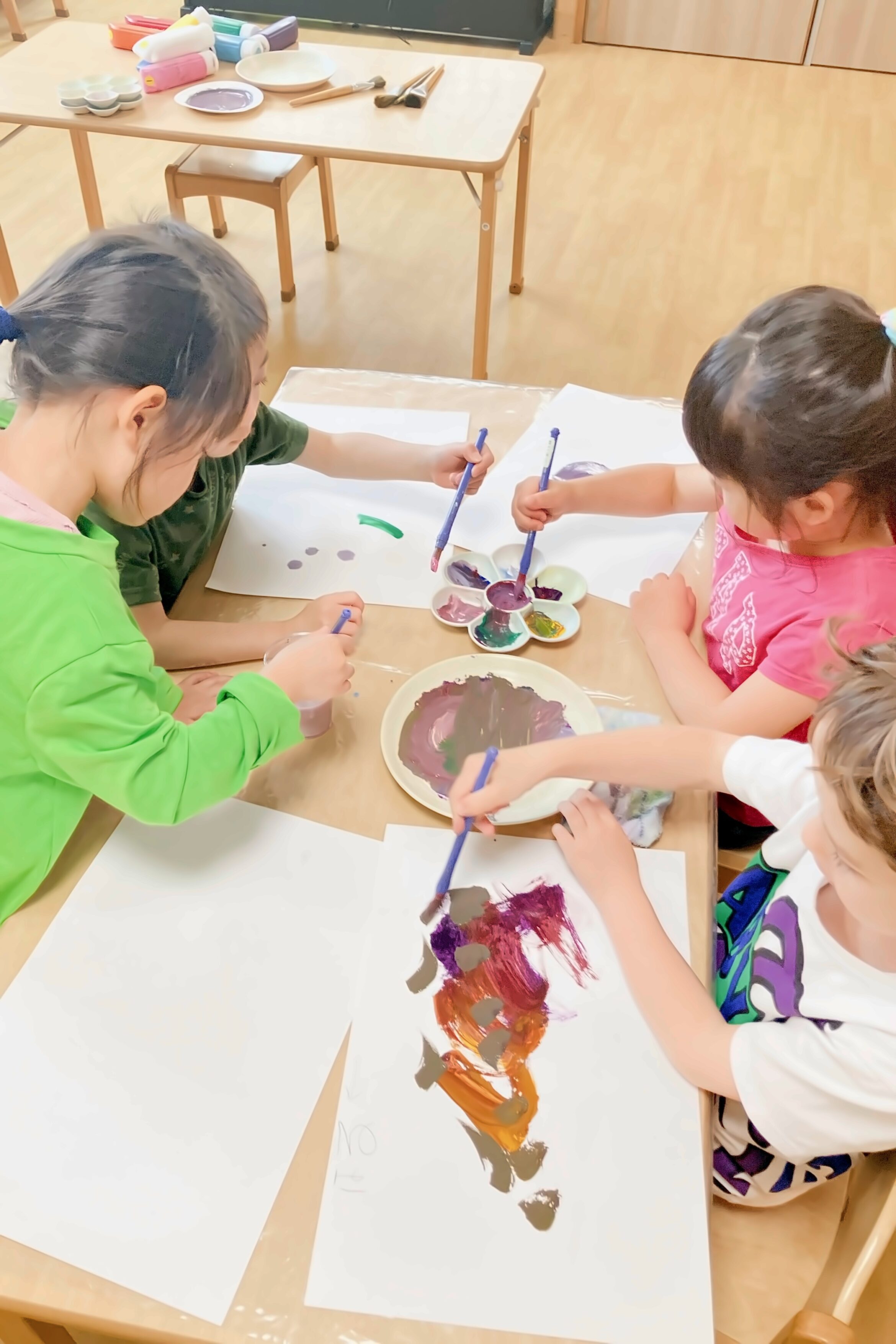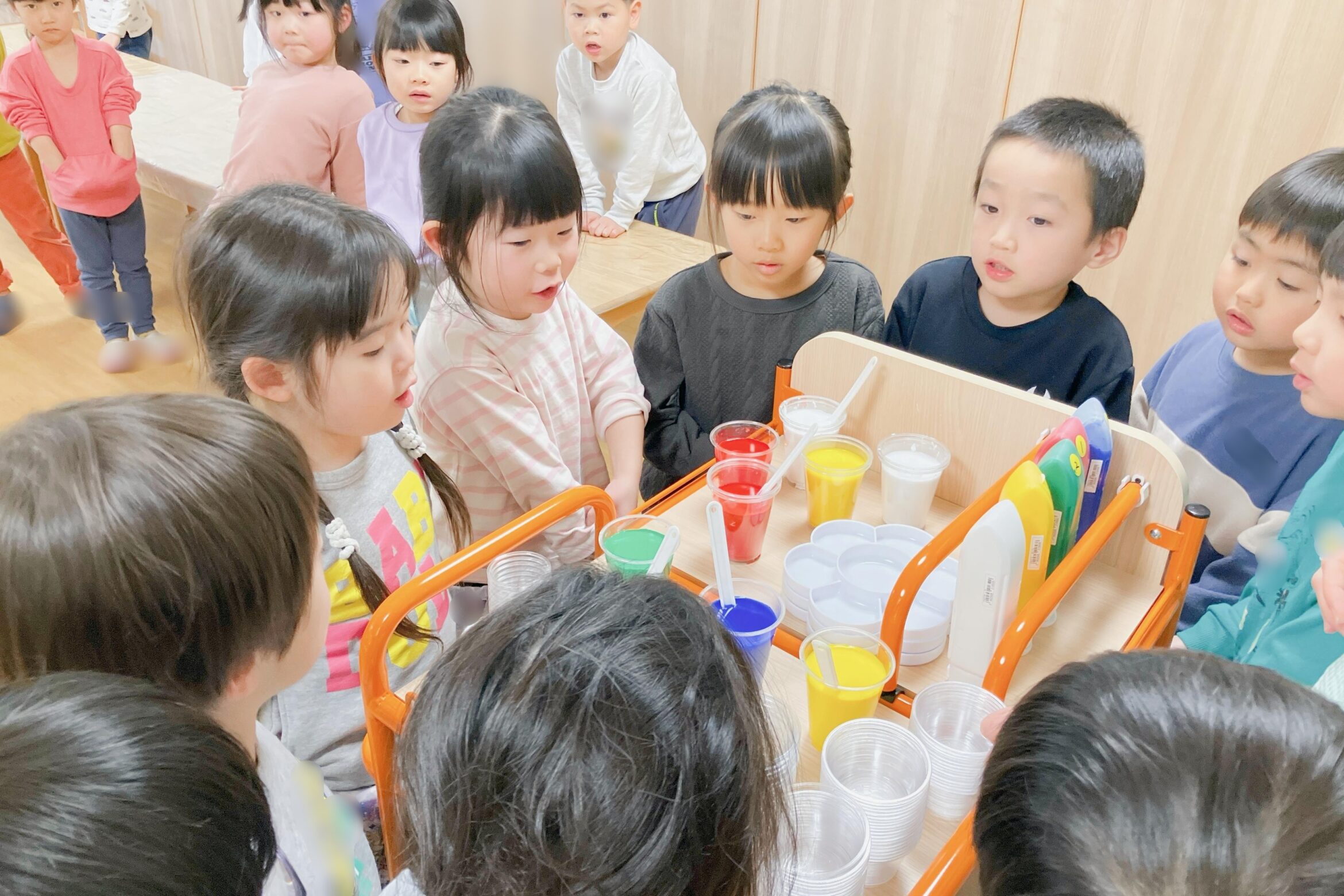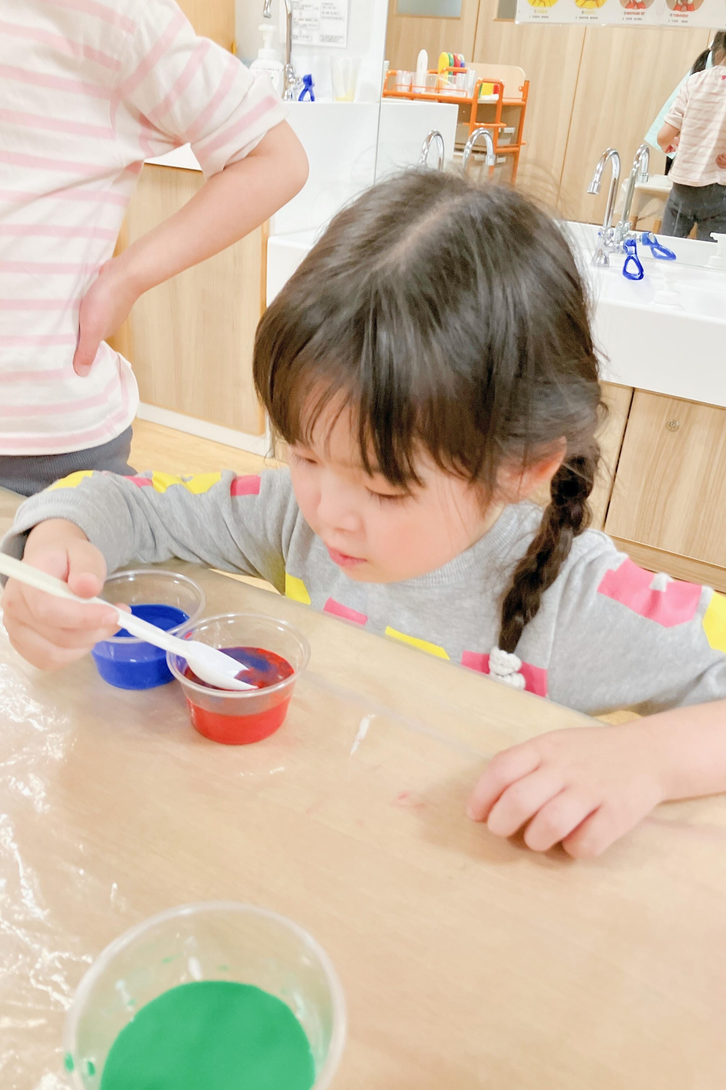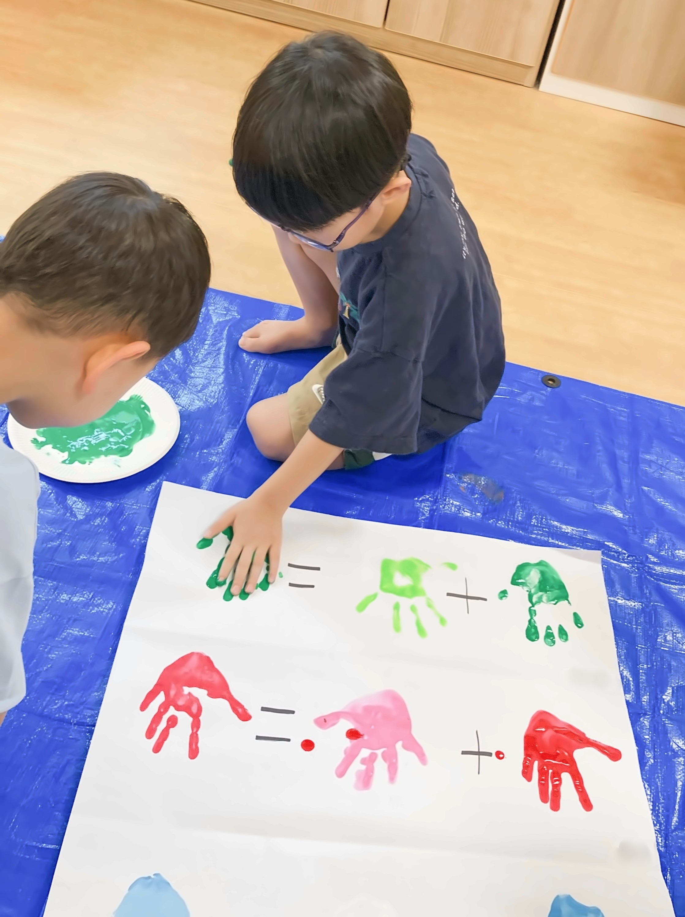 好きな絵の具を2種類選び、混ぜたら何色になるのかをワクワクしながら楽しみました。思った色になって喜ぶ子、思っていたのと少し違って「もっとこうしたかった」と話す子も。