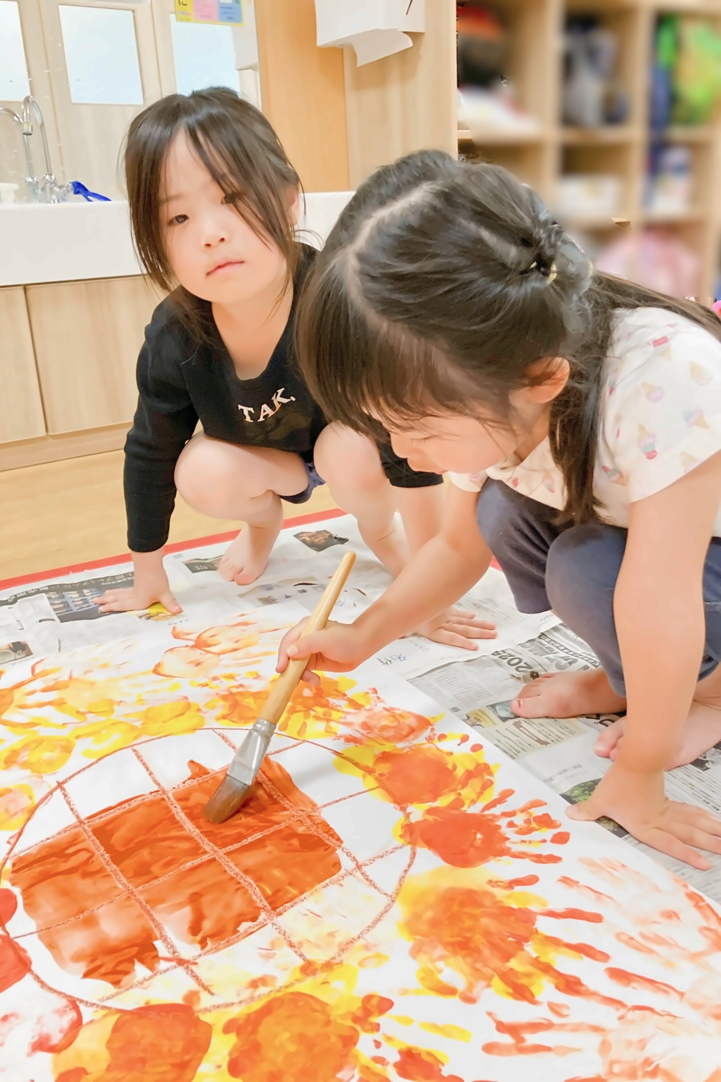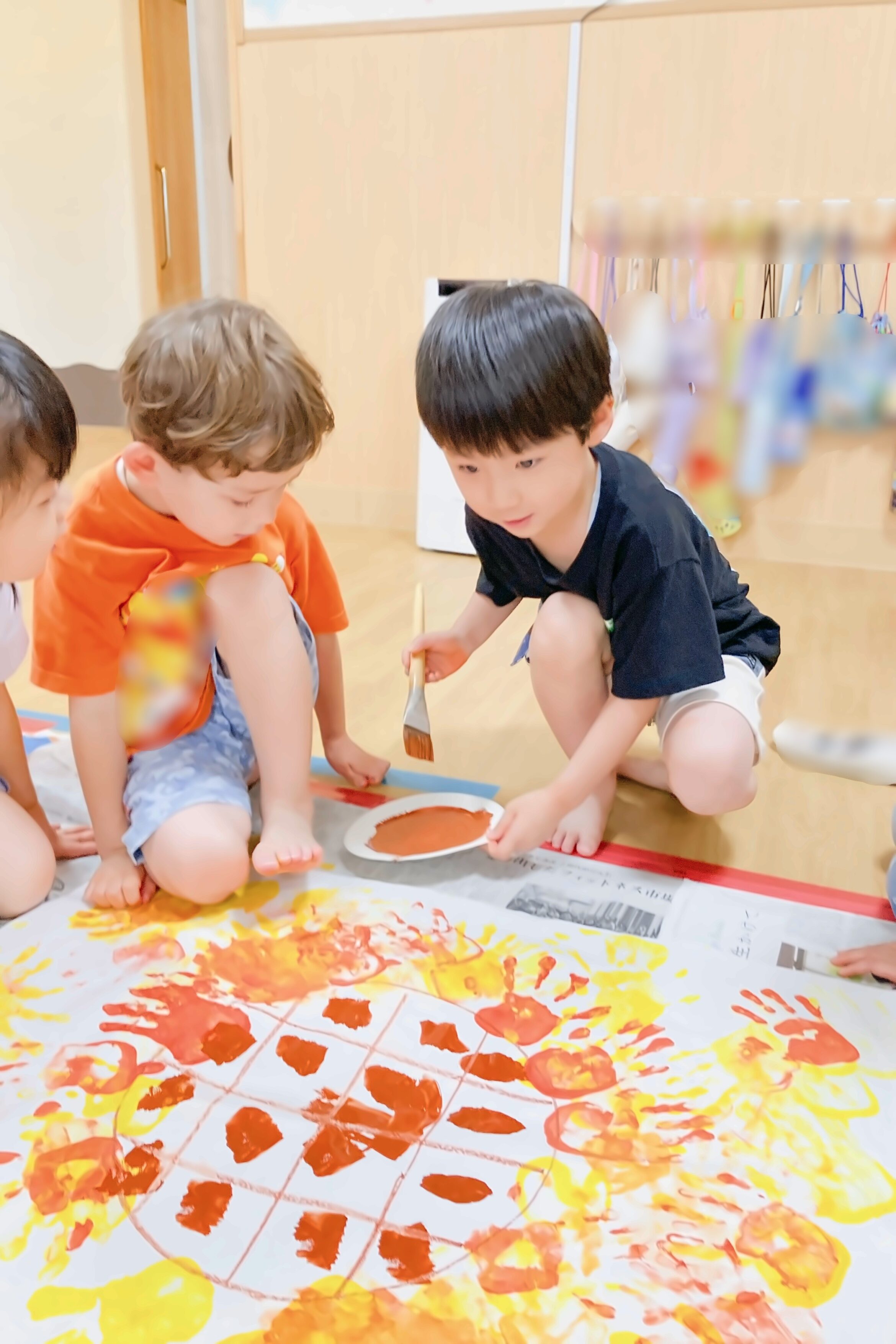 夏の製作では自分たちで色を選び、協力してひまわりを描きました。
