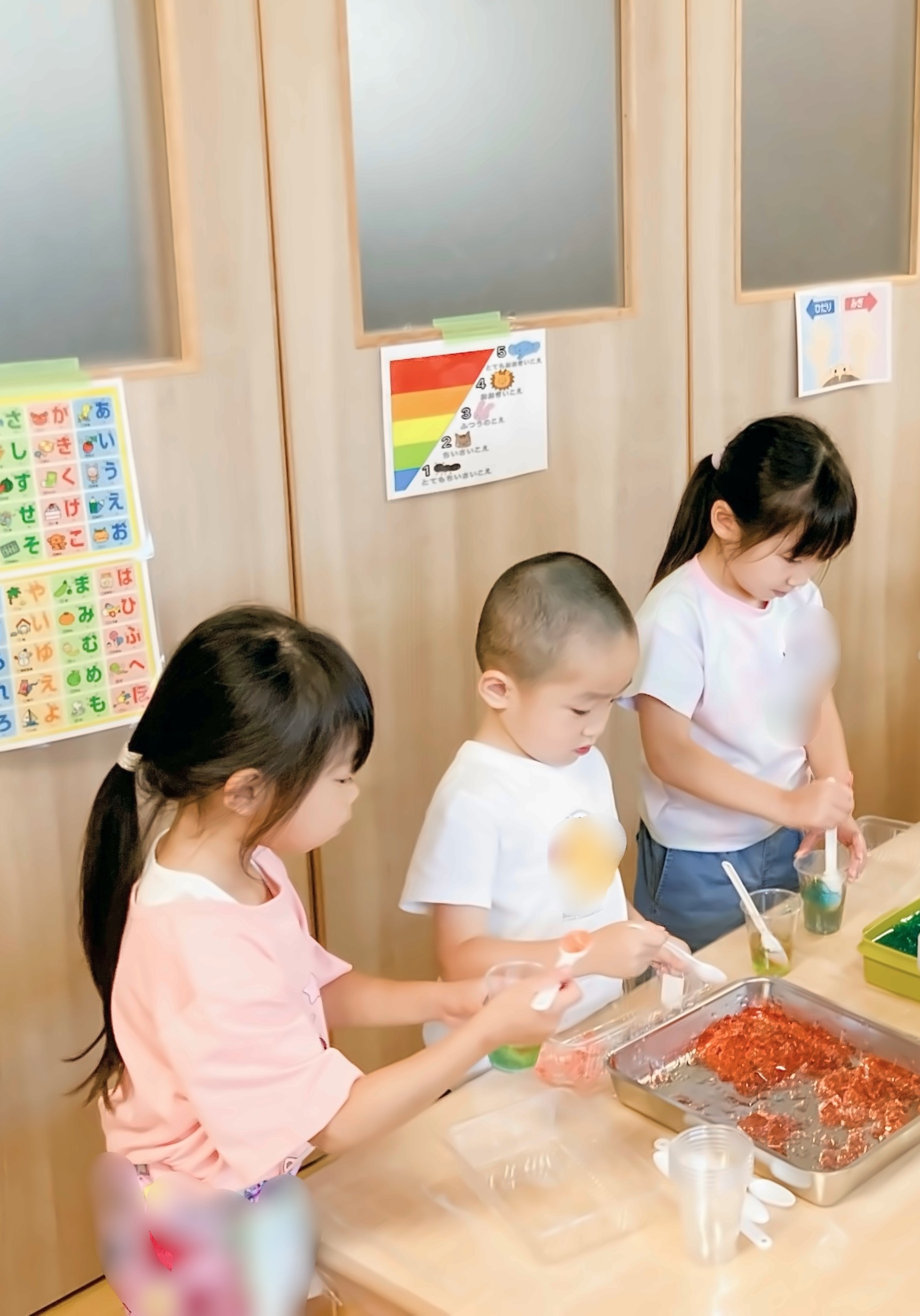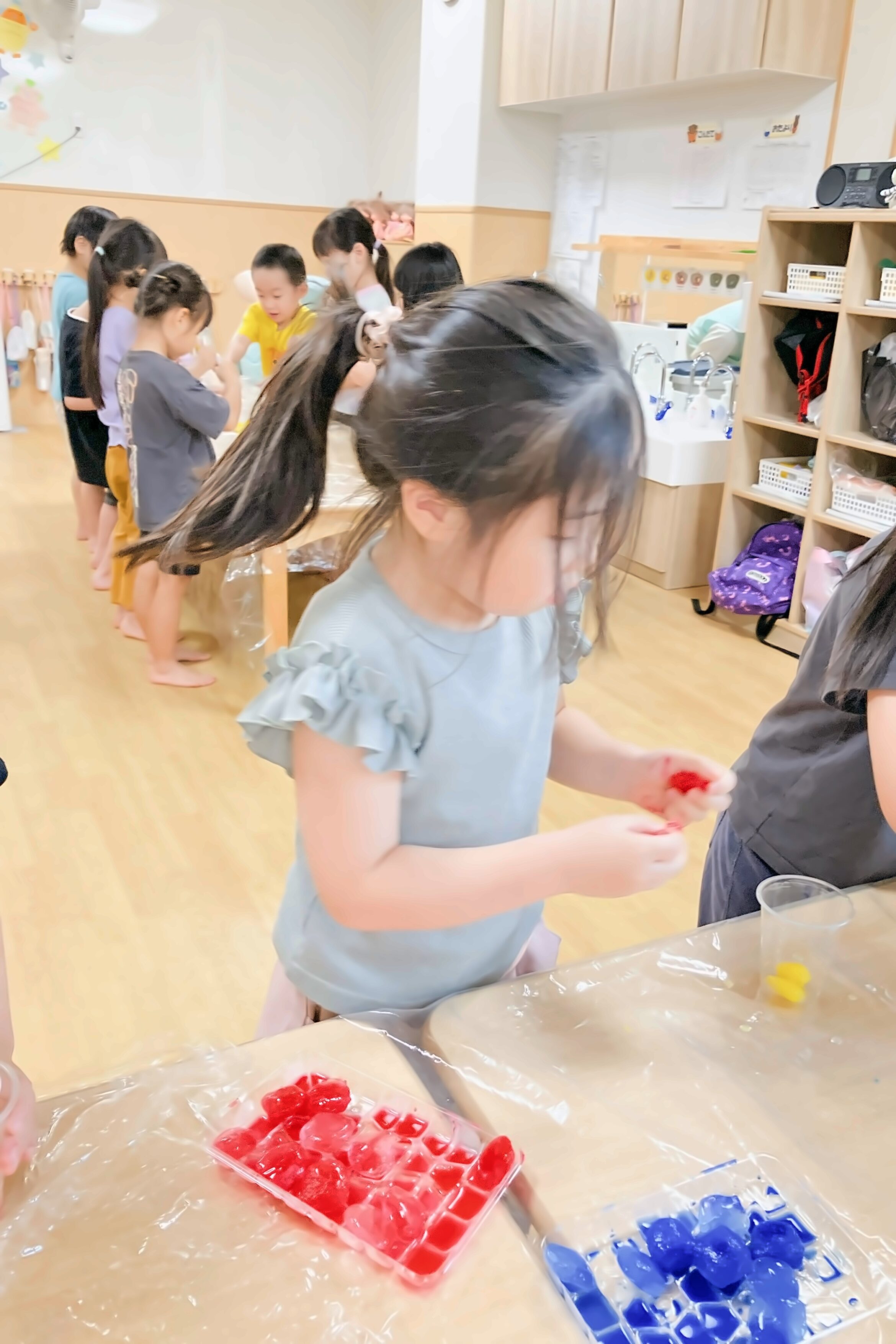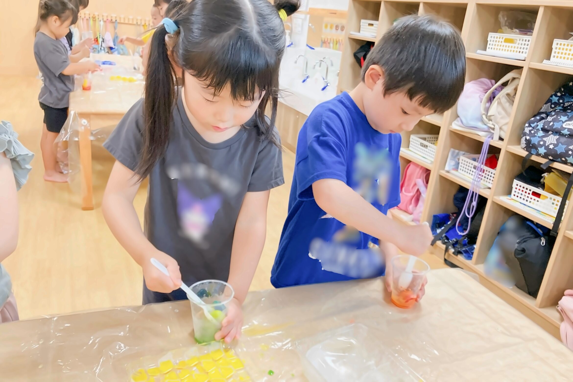 色のついた氷を使った遊びも。氷から色が出てくるのを楽しんだり・・・出てきた色を混ぜたり、凹凸のある容器に好きな色を入れたりと楽しむ姿がありました。