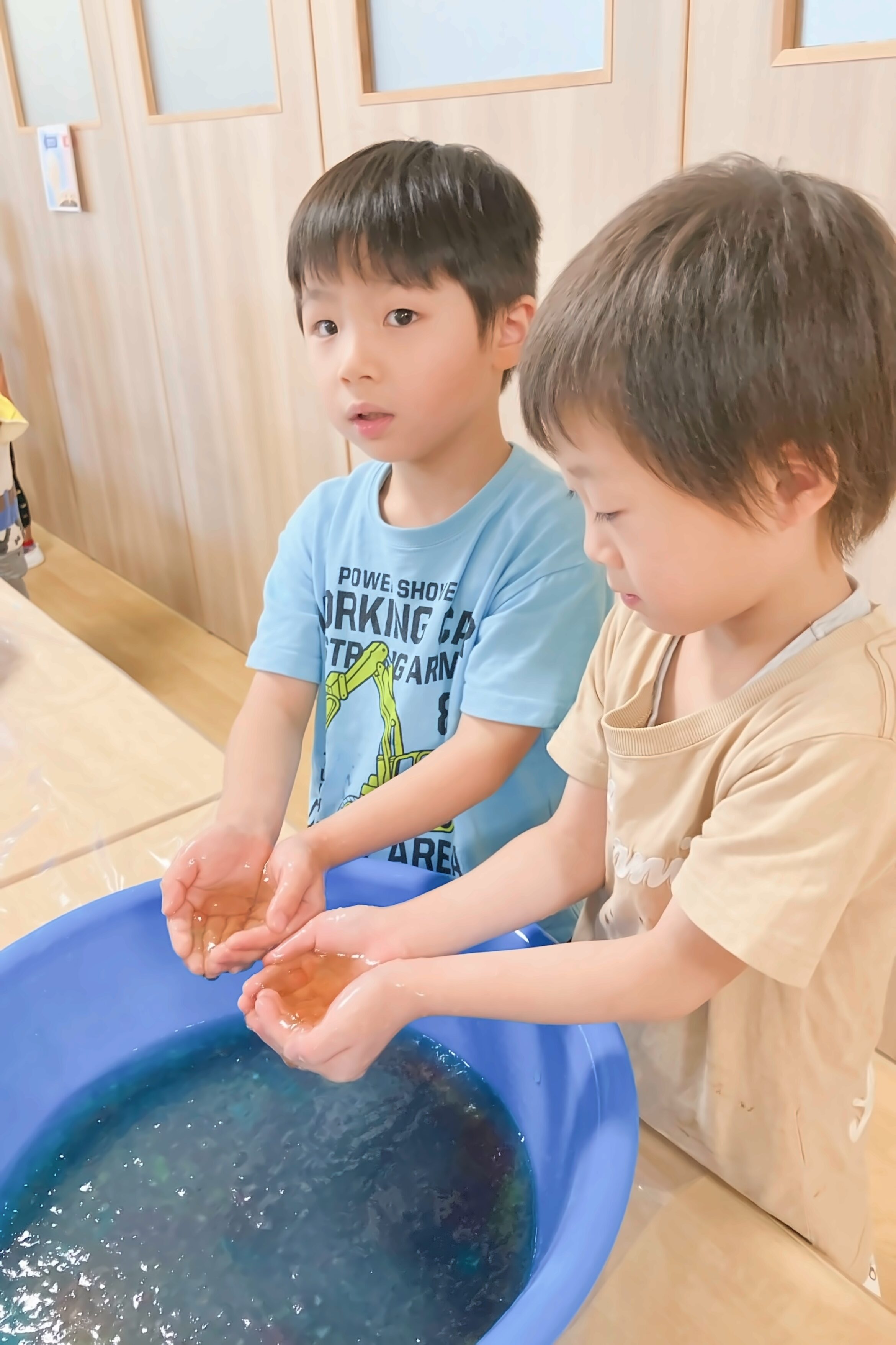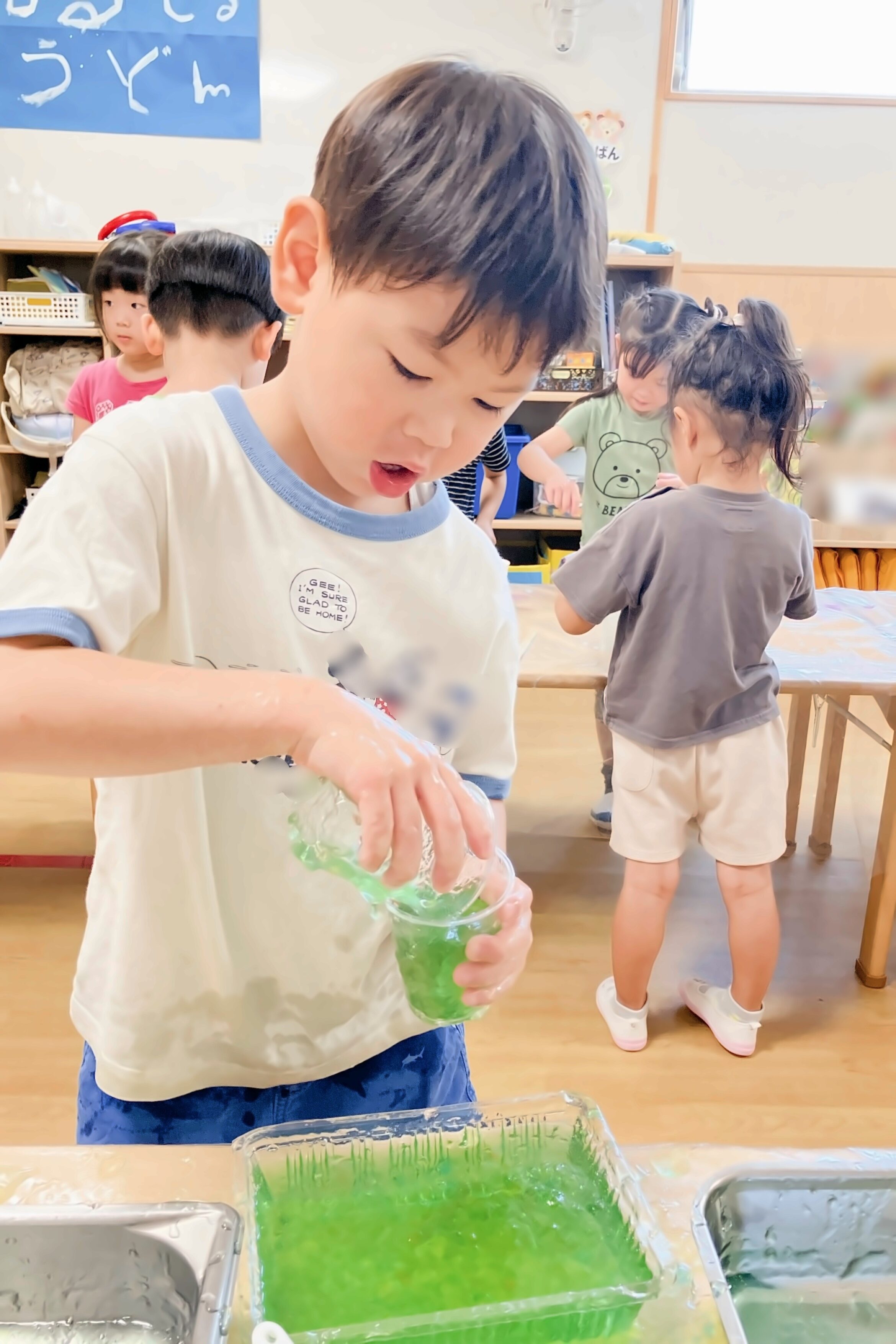 一緒に寒天で感触遊びと色遊びを行いました。絵具と違ってきれいに混ざり、「みてー!」と見せる姿も。