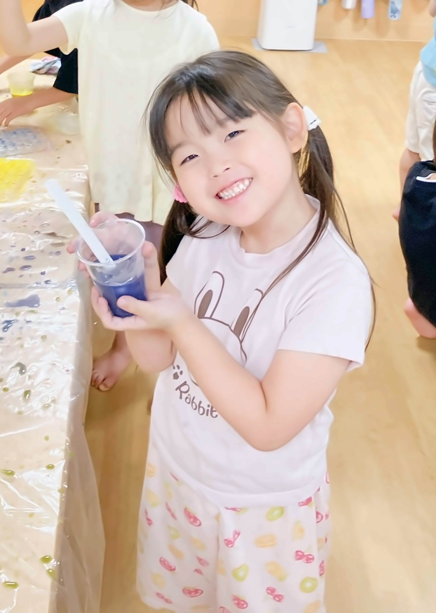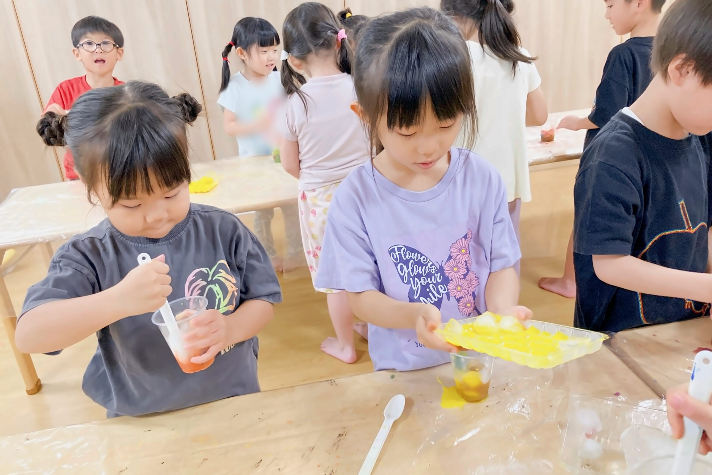 製作を行った際に、絵の具が混ざる様子を見て興味をもったり、「違う色同士ではどうなるんだろう」という子どもたちの疑問からテーマを色水に設定しました。