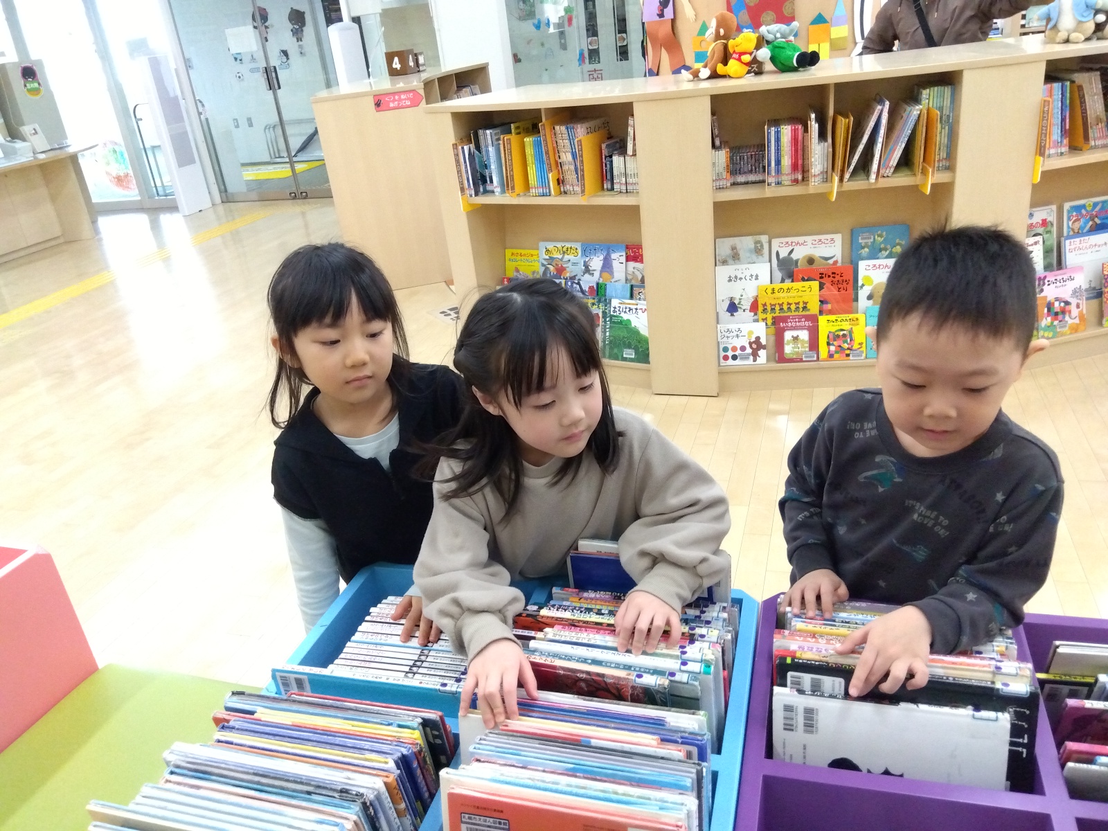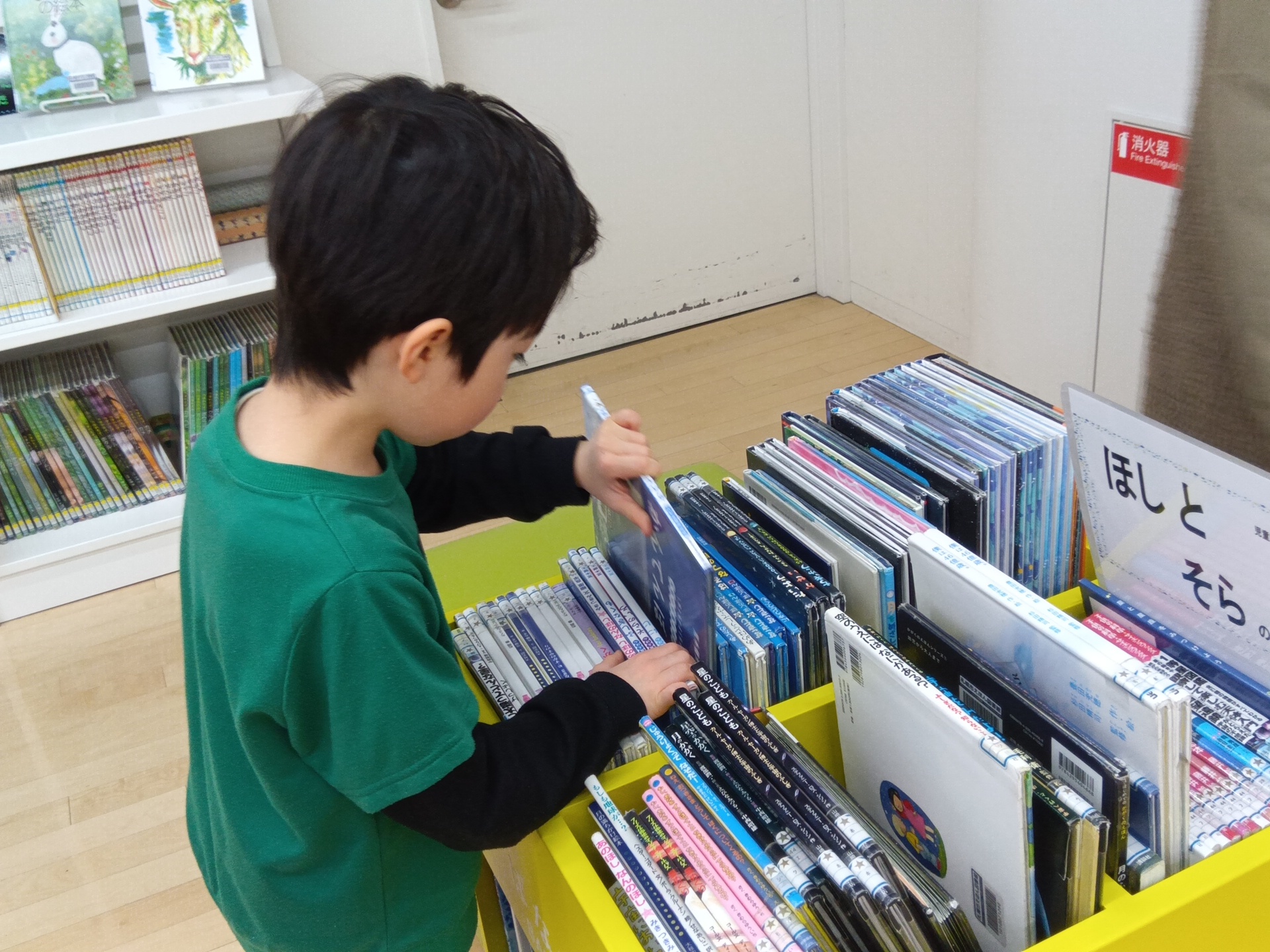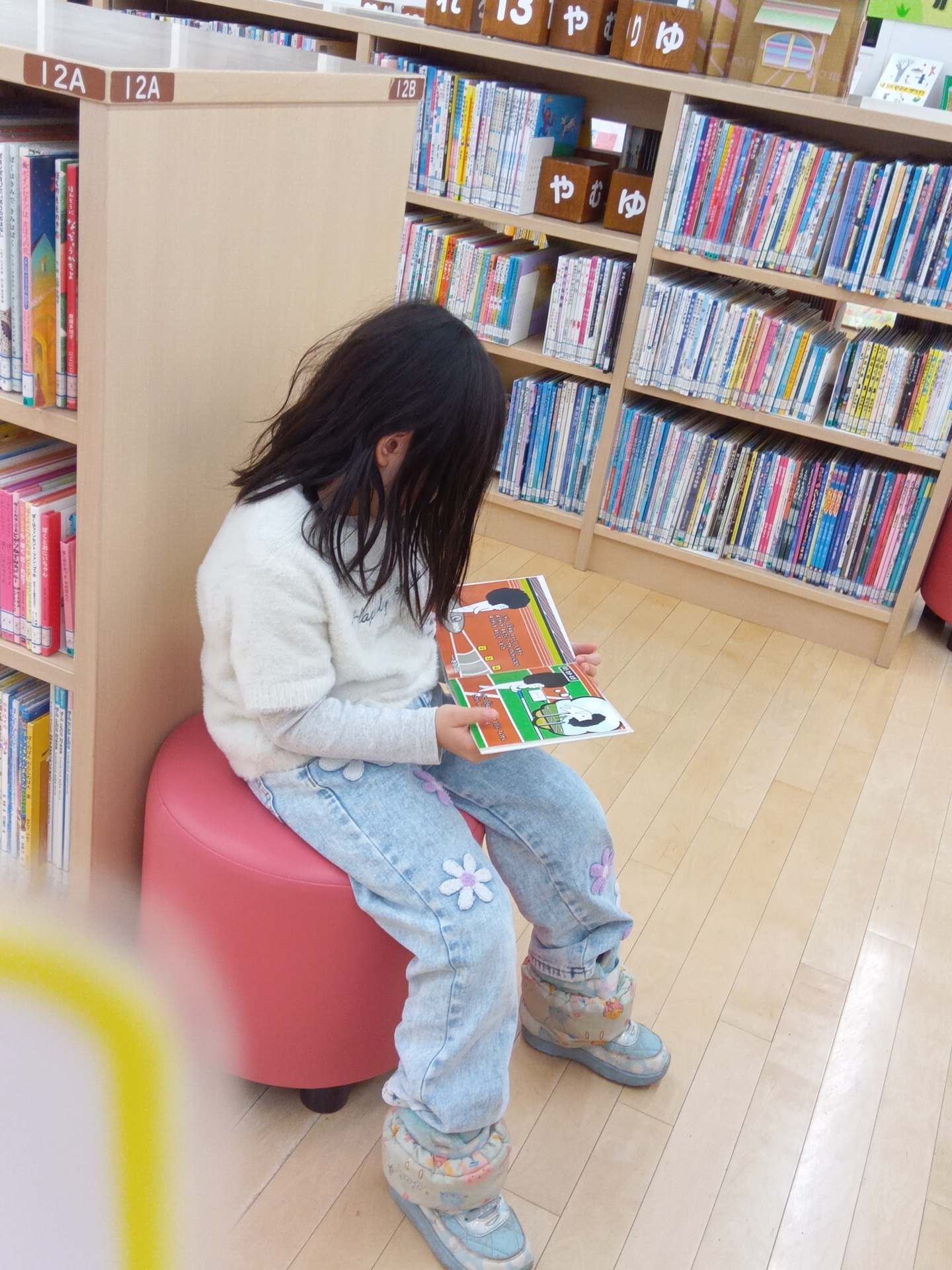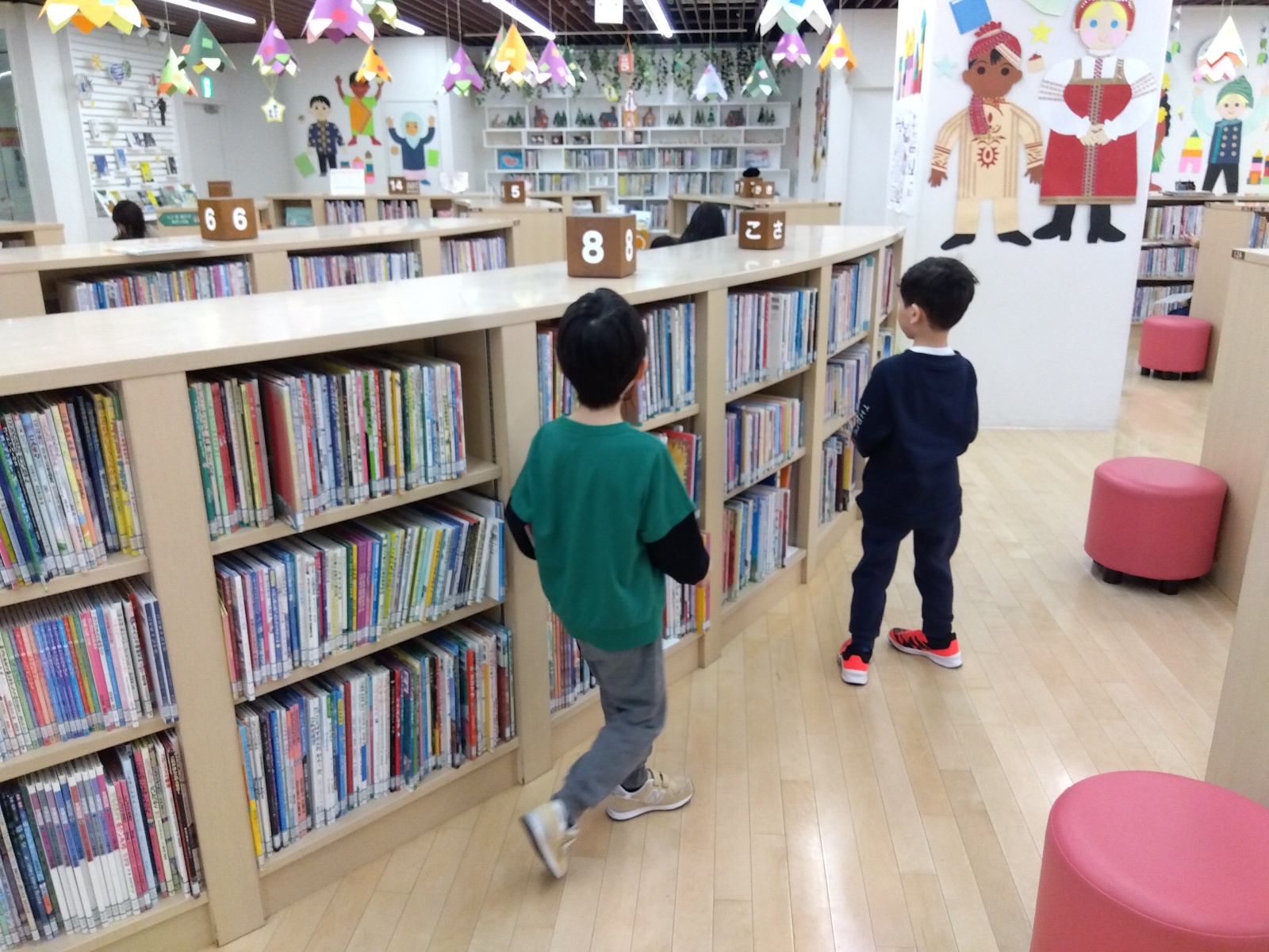 読み聞かせのあとは、好きな本を1冊選んで借りてきました。たくさんの絵本の中から1冊を選ぶのが大変そうでしたが、図書館の中をじっくりまわりながら選んでいました。