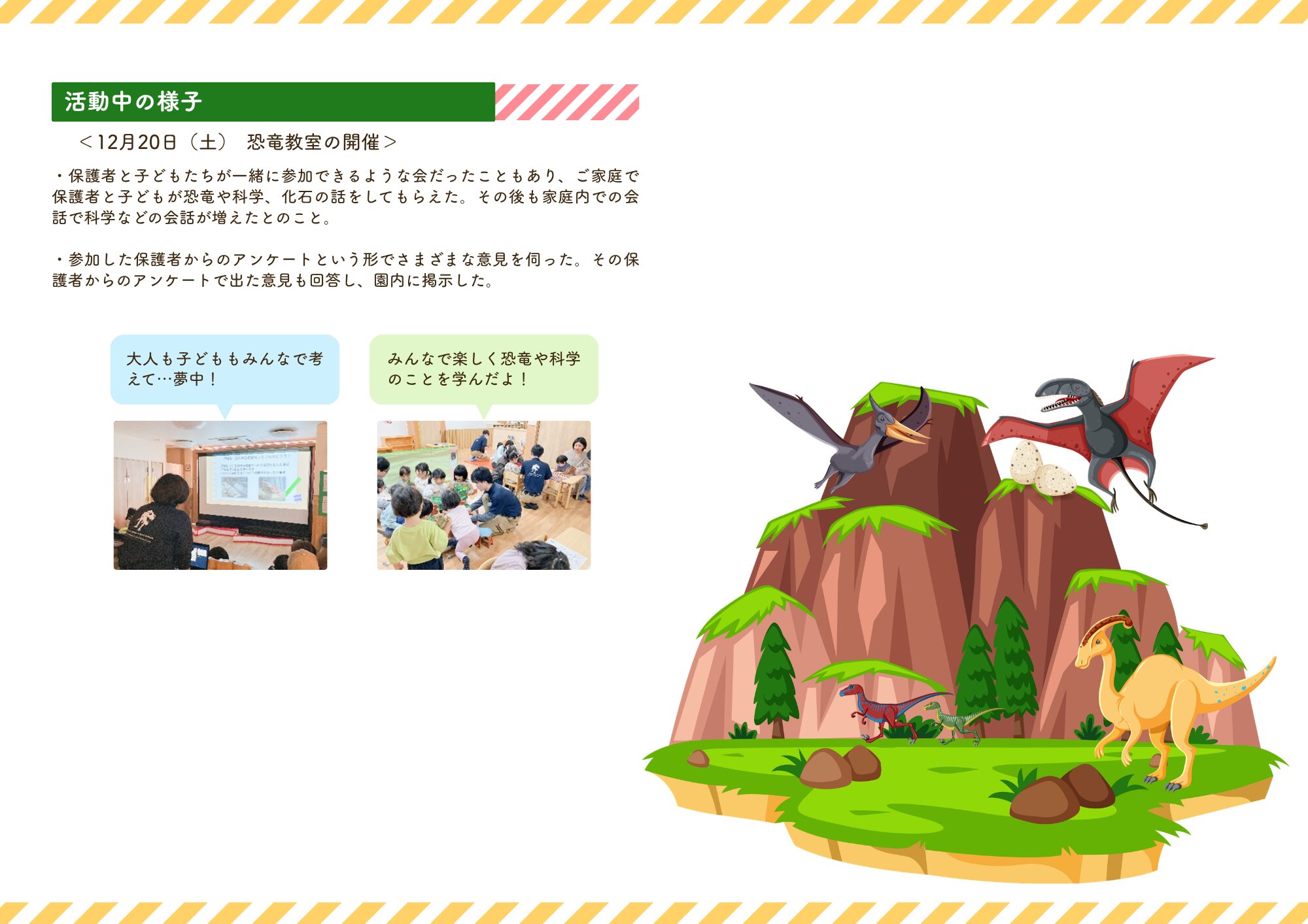 今年度は、「<科学>と<恐竜>」をテーマに1年間取り組みました✨取り組みを通して、たくさんの発見や気づきを得た子どもたち。活動の内容や様子をぜひご覧ください♪