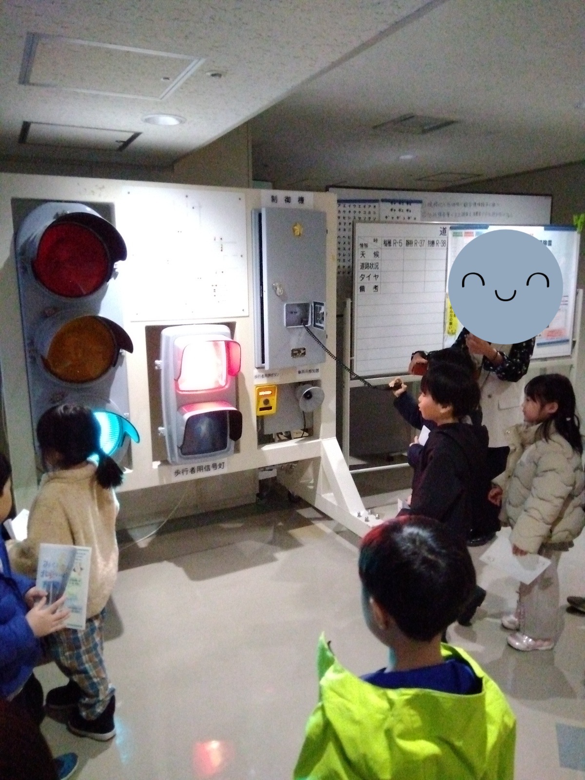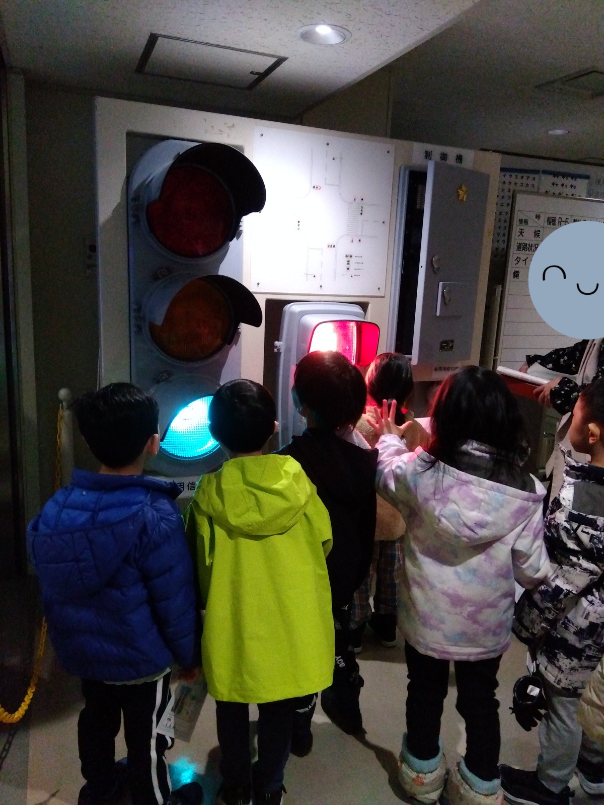 この日は、通報件数や、道路の状況が変わることが多く、大きなモニターに表示される色や、デスクで光るランプの意味など、いろいろなことを教えてもらい、それが変わるたびに「どこどこ??」「あった!」と子どもたちも釘付けでした。