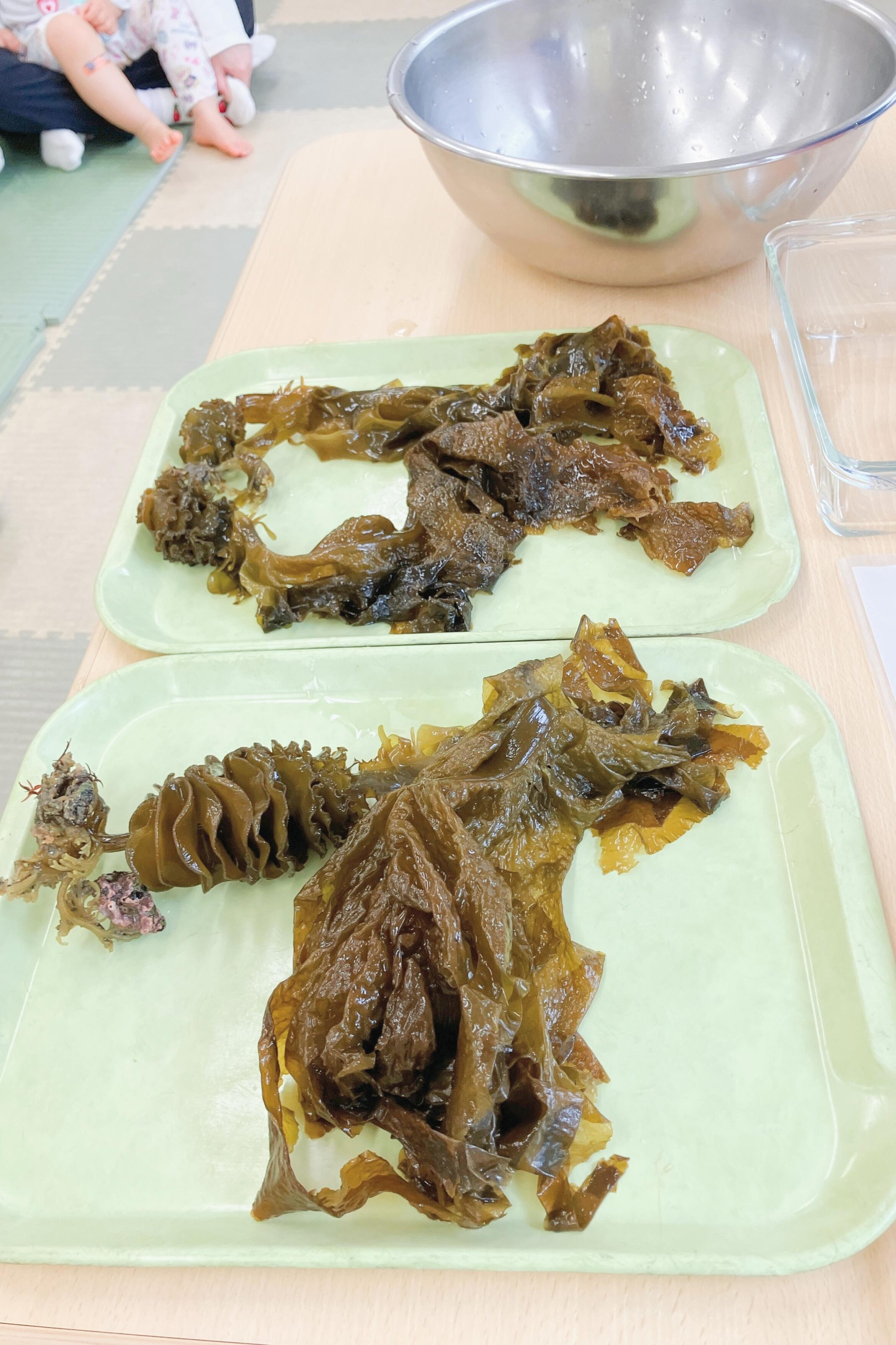 2026.03.31 平戸町保育室 海の恵み~わかめ~ 3月の食育活動の様子です♪ 3月は、生のわかめをみんなで見ました。 「海の匂いがするねー、やわらかいねー」 お湯につけたら色が変わってみんなびっくり! 4月からもいろんな活動を楽しもうね♪
