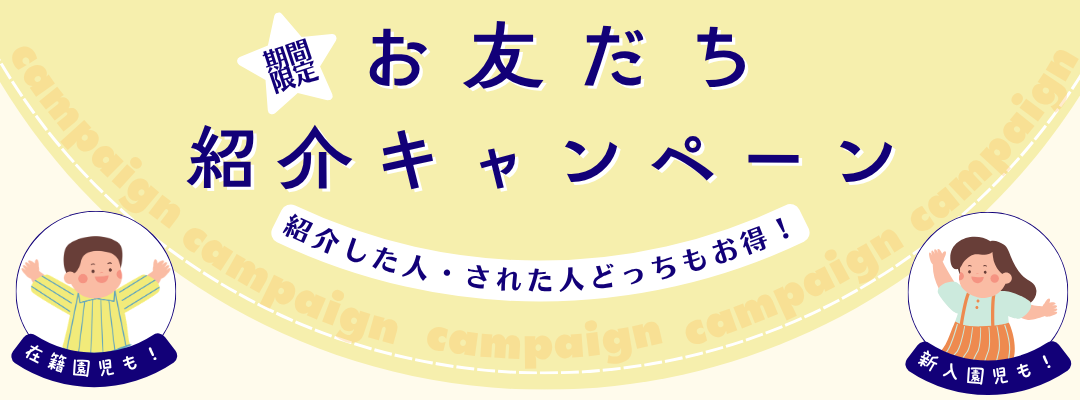 在籍園児からのご紹介で入園をされた方限定で、入園料が無料になるキャンペーンを実施します!紹介した在籍園児にも特典があります🎁