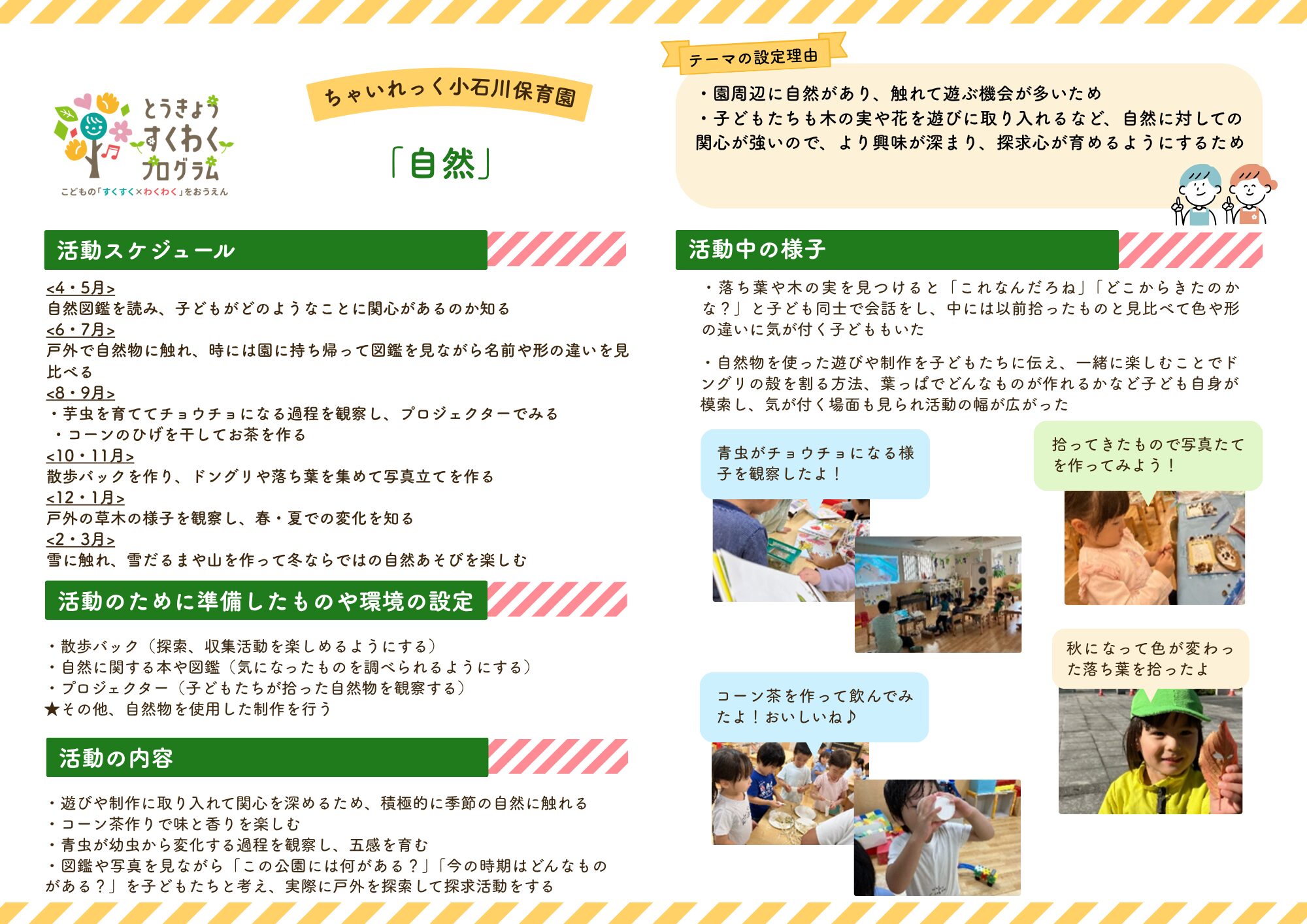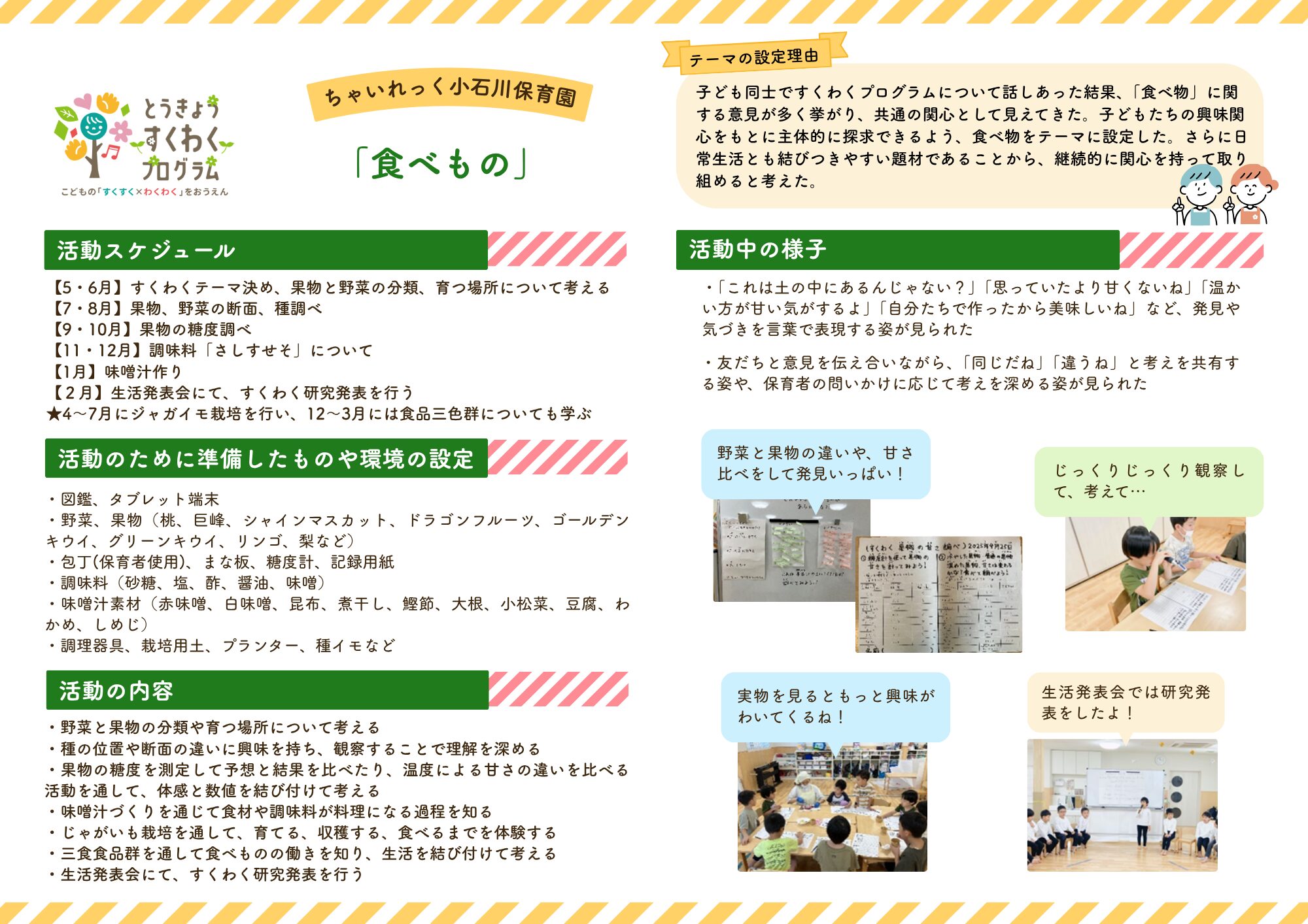2026.04.02 小石川保育園 とうきょうすくわくプログラム ちゃいれっく小石川保育園では、東京都が実施する「とうきょうすくわくプログラム」に参加しています。 とうきょうすくわくプログラムとは、子どもたちが好奇心や興味をもって、わくわくしながら遊び、学べるよう応援する取り組みです。 2025年度は、3歳児クラスが「自然」、5歳児クラスが「食べもの」をテーマに1年間取り組みました✨ 取り組みを通して、たくさんの発見や気づきを得た子どもたち。活動の内容や様子をぜひご覧ください♪ 報告書(3歳児)はこちら報告書(5歳児)はこちら
