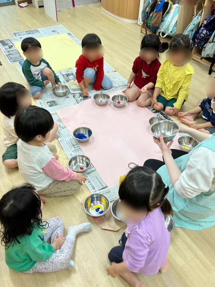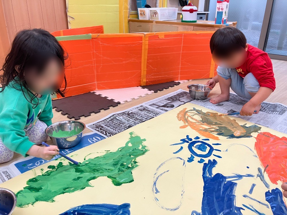 3歳児クラスでは、日中お部屋で絵の具を使った活動をしました。
