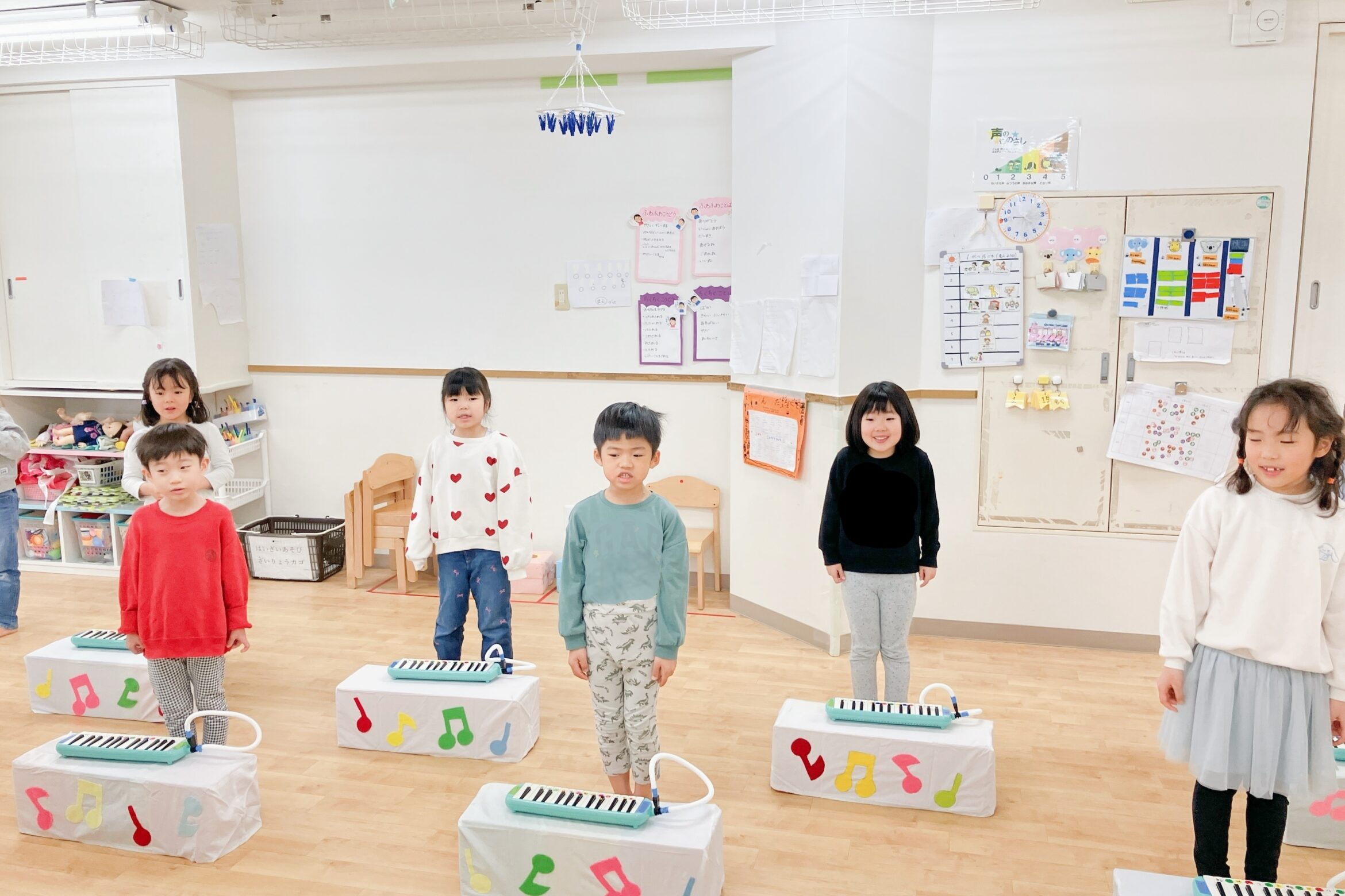 異年齢で毎日行うリズム遊びは、指先から足先までの全身運動!全員で行うからこそ、大きなお友だちを見て刺激を受けたり、見て学んだり、順番を守ったり…非認知能力が身につきます。
