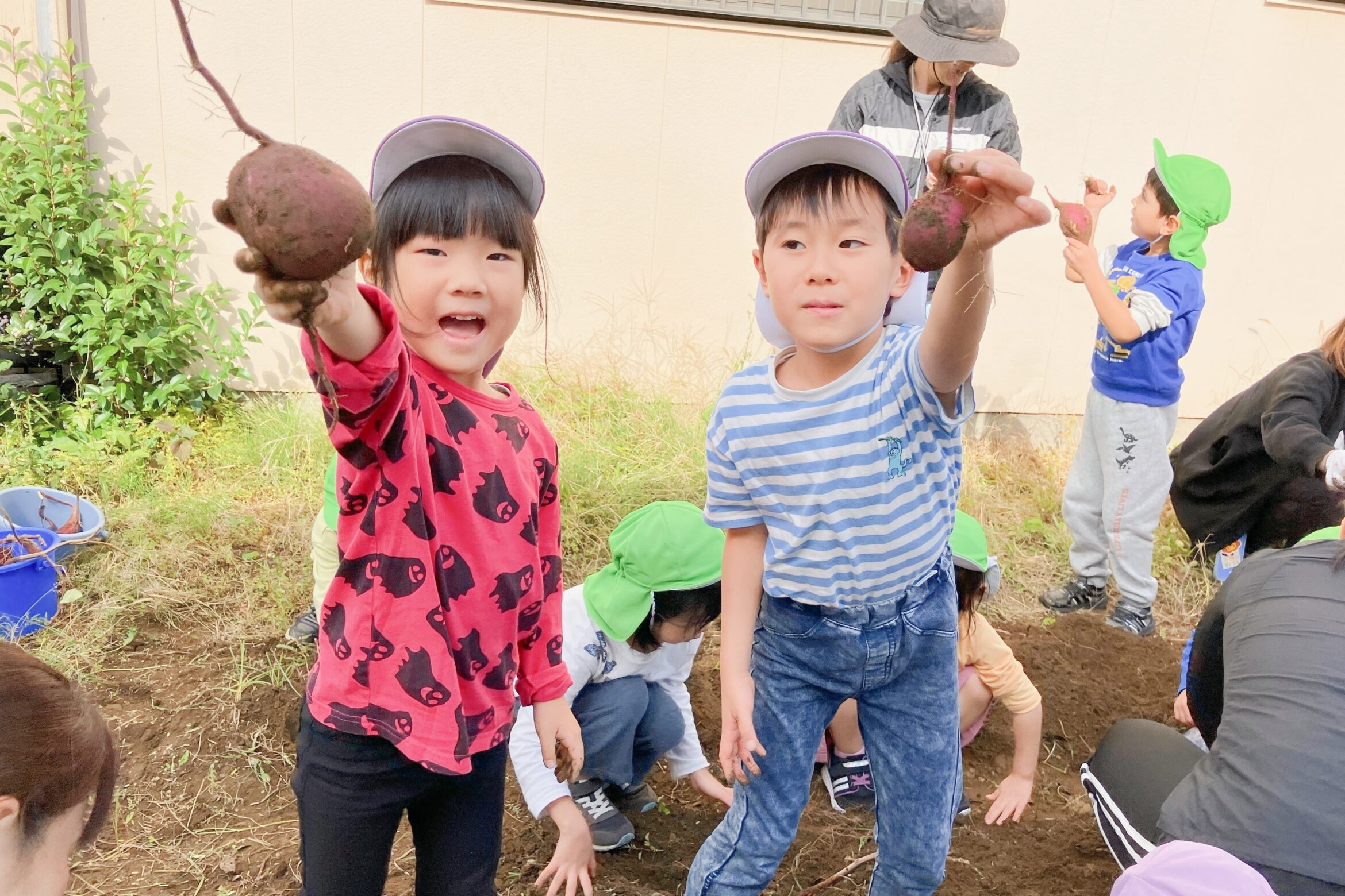 毎日全クラスでリズム遊びを行い、体幹や脳の発達を促すことで、非認知能力を身につけ、カラダの基礎をつくっています。また園の隣の畑では、サツマイモやバケツ稲といったさまざまな野菜を育て、食育を楽しんでいます。子どもたちが多くの経験や体験を通してやりたい気持ちを育めるように、支えていきたいと思っています。