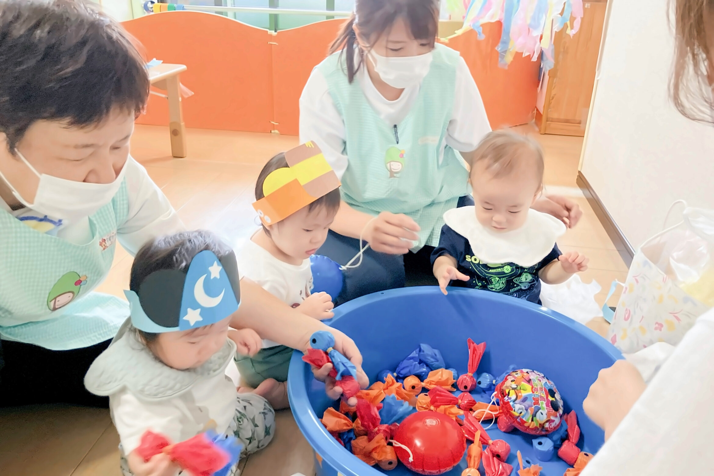 おやつを食べたり、室内遊び、リズム遊びをして過ごします。