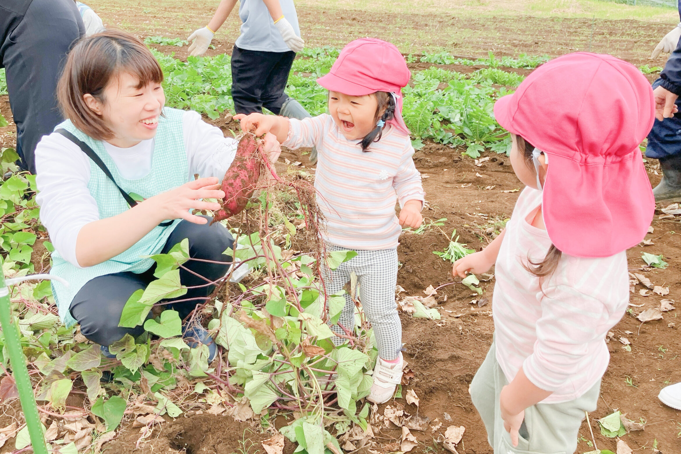 クッキング保育に野菜栽培など、食材に直に触れて「食」への興味関心を持てるようにサポート。また、読み聞かせとの連動も遠し、子どもたちの「ワクワク!」を高めます。