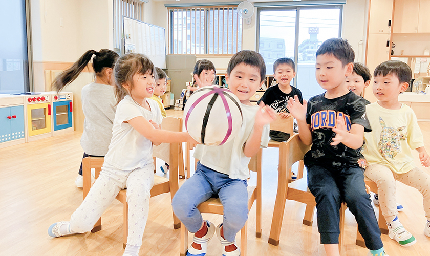 異年齢で毎日行うリズム遊びは、指先から足先までの全身運動!全員で行うからこそ、大きなお友だちを見て刺激を受けたり、見て学んだり、順番を守ったり…非認知能力が身につきます。