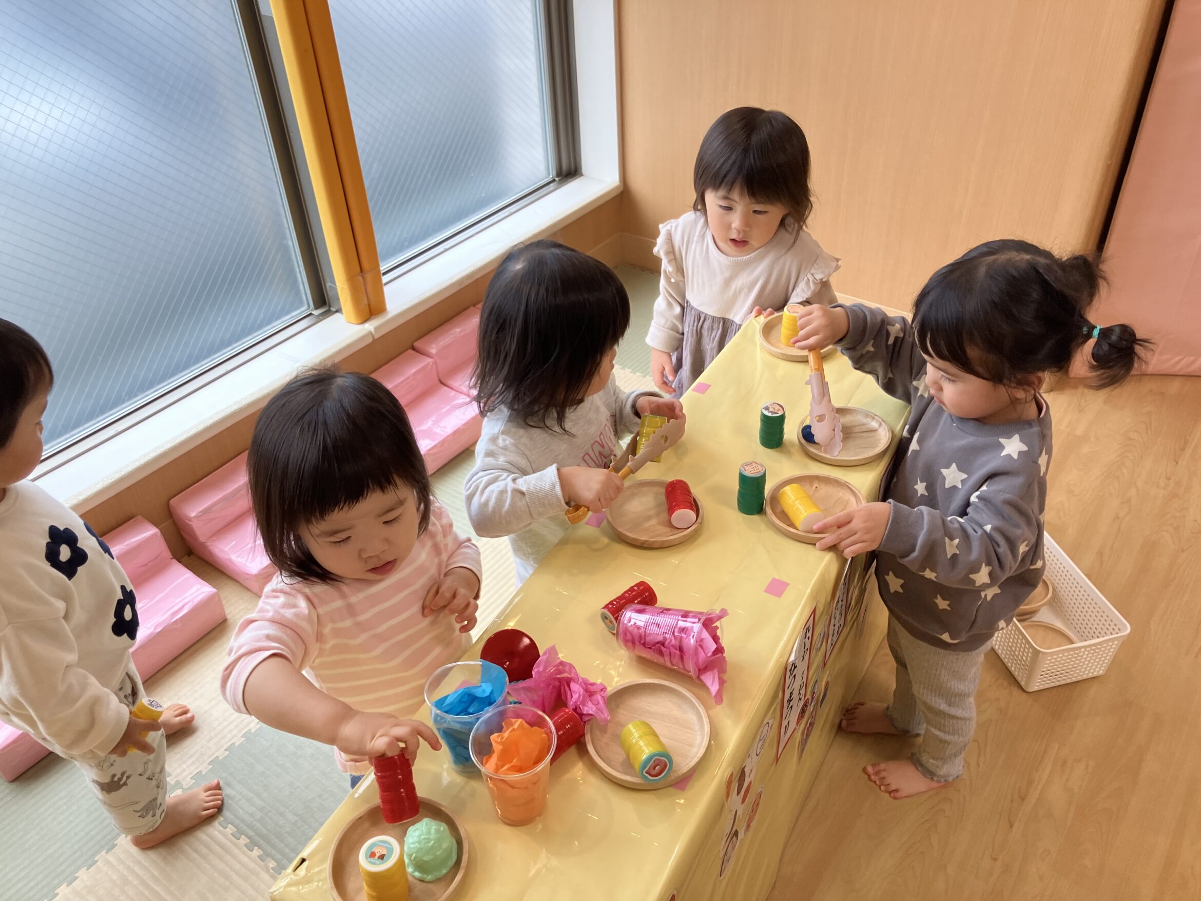 異年齢で毎日行うリズム遊びは、指先から足先までの全身運動!全員で行うからこそ、大きなお友だちを見て刺激を受けたり、見て学んだり、順番を守ったり…非認知能力が身につきます。